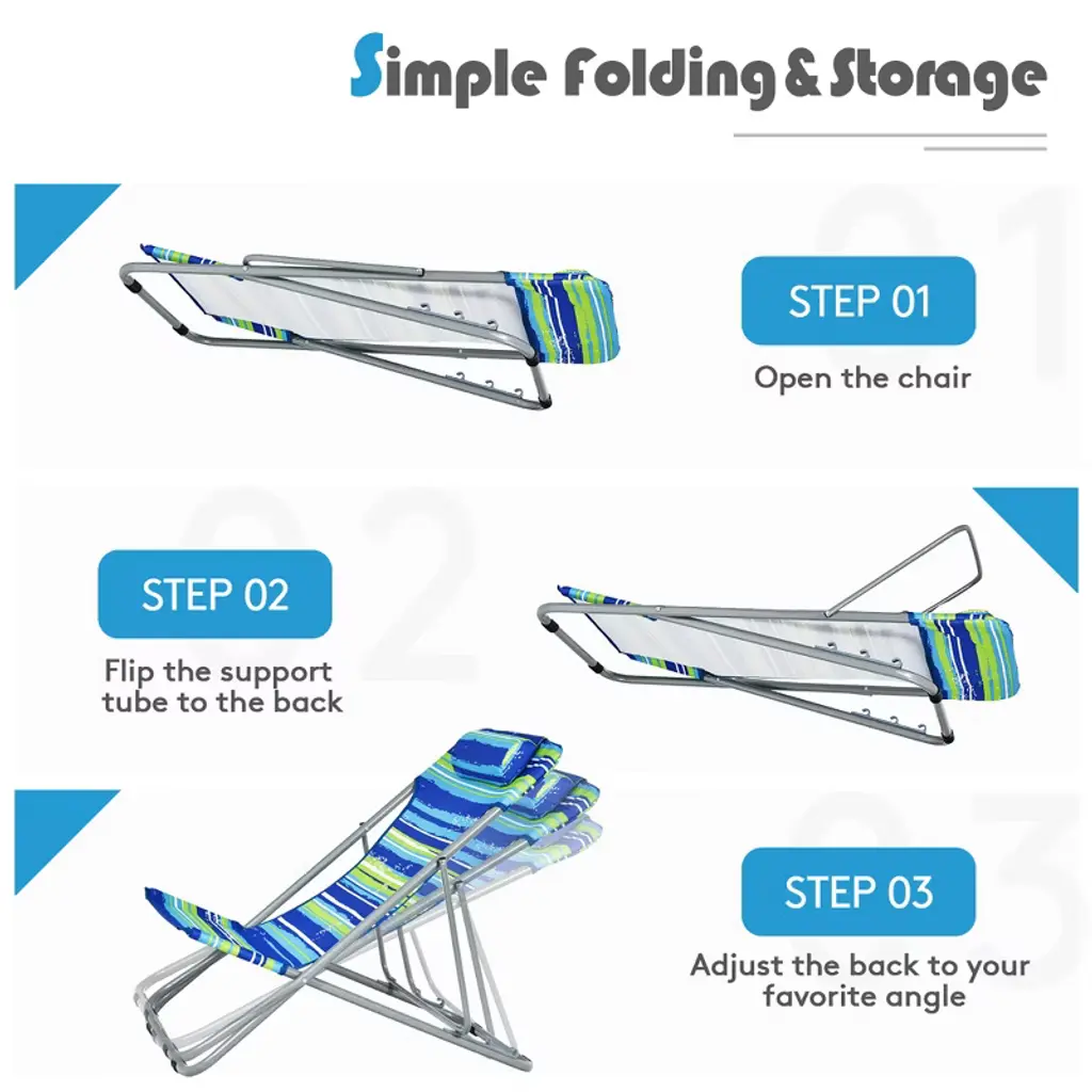 Are you looking for a portable camping chair for your outdoor activities? This camping chair set will be a great choice for you to enjoy leisure time with friends. 3-position adjustable backrest is designed to give you more comfort, and you can sit or lay down as you like. Sturdy frame with sturdy fabric ensures long time service. Besides, the soft headrest can relieve the pressure on your neck and eliminate your fatigue immediately. With waterproof and wear-resistant fabric, the beach chair is sun protection and can be used outdoors. In addition, the folding design is easy to use, so that you can open and fold the chair in a short time, which saves your time and energy. Plus, this portable chair set is also suitable for the beach, camping, hiking, picnic, etc.FeaturesSteel frame is sturdy enough to support up to 300 lbs Adjustable backrest with 3 positions for better experience Breathable fabric keeps cool in the hot summer Folding chairs with lightweight design are easy to carry and store Comfortable headrest can relieve the pressure on your neck Widely used in beach, swimming pool side, yard, patio, lawn, camp No assembly required and it is simple to clean and maintainColor: Blue\Green\Orange Material: Steel, Sponge, Fabric Dimension of Each Chair: 36-38''x24.5''x26''-33'' (L x W x H) Weight Capacity of Each Chair: 300 lbs Net Weight: 20 lbs Package include: 2 x Beach Chair 1 x Instruction