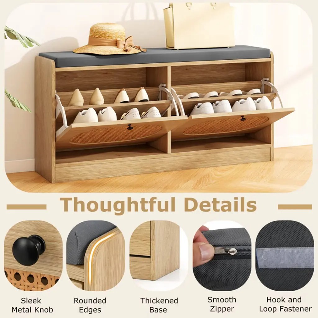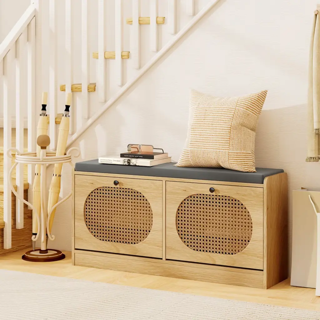 Organize your entryway in style with this rattan shoe storage bench! This shoe rack bench is equipped with two flip-over doors that reveal a spacious storage area, allowing you to customize the space according to your needs. Whether you want to store boots, sneakers, or sandals, the adjustable shelves make it easy to accommodate various types of footwear. Additionally, the rattan detailing on the doors combine practical storage with an elegant design. Upholstered with a sponge-padded cushion, this entryway bench offers a comfortable place to sit while you put on or take off your shoes. Notably, the boho shoe cabinet organizer seamlessly fits into a range of home styles. Features2 flip-over doors provide ample shoe storage space while hiding clutter Breathable PE rattan woven doors boast perfect visual effect and ventilated design 2-position adjustable shelf customizes the storage space for different types of footwear Shoe bench with cushion allows you to sit comfortably to change shoes Wear-resistant polyester fabric and high-density sponge filling for comfort Thickened base is built with strength and great support Sleek metal knob is easy to open and close the doors Rounded edges are designed to prevent scratches or bumps Thoughtful details include smooth zipper, hook and loop fastener Suitable for hallway, entryway, living room and bedroom Assembly neededColor: Natural & Gray Material: Engineered Wood, MDF, PE Rattan, Polyester Fabric, Sponge Product Size: 40" x 9.5" x 19" (L x W x H) Inner Size of Shelf: 18.5" x 8.5" x 4.5" (L x W x H) Dimensions of Seat Cushion: 38.5" x 9.5" (L x W) Adjustable Range of Shelf: 0.6" Weight Capacity of Shoe Bench: 265 lbs Net Weight: 36.5 lbs Package Includes: 1 x Shoe Storage Bench 1 x Seat Cushion 1 x User's Manual