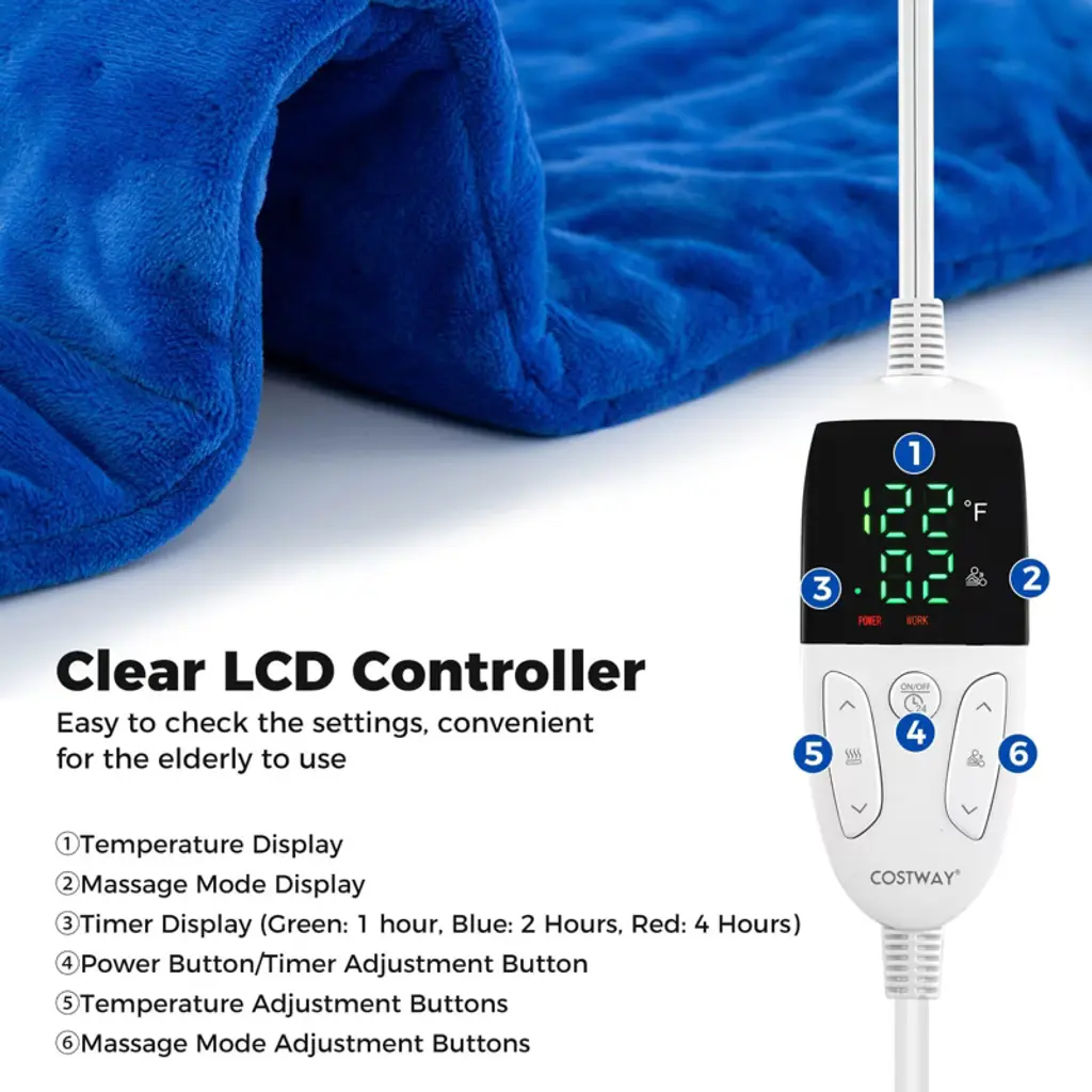 Provide Soothing Warmth and Targeting Massage for the Whole Body! Perfectly sized at 22.5" x 12" (L x W), our small weighted heating pad is ideal for targeting various body parts such as the neck, shoulders, waist, abdomen, legs, and feet, effective reliving muscle tension for better relaxation. It comes with internal vibration massagers and glass beads that conform snugly to various body contours, particularly easing areas prone to pain and discomfort. Moreover, with 5 heating settings, 9 massage modes, and 3 timer settings, you are in full control of your relaxation experience. Safety is paramount with the PTN+NTC dual sensor heating wires, providing even and quick heating, along with overheat protection, ETL, FCC, and UL certifications for peace of mind. Crafted from premium double-sided crystal flannel material, this electric heated pad is not only luxurious but also easy to care for and clean, which is machine washable. Whether for personal indulgence or as a wellness gift for loved ones, our heating mat can be a perfect choice!FeaturesThe massagers and heating wires provide soothing heating and comfy massage Filled with glass beads for perfect body conformity, offer immediate heat penetration Adopts PTN+NTC dual sensor heating wires, safe and quick to warm in 7 minutes Covered in crystal flannel material, delivers a luxurious experience against your skin Adopts safety-certified heating parts and controller, certified by UL, FCC, and ETC Equipped with 5 heat settings from 104-140 °F, suit your preference Equipped with 9 massage modes to target specific areas and relieve muscle tension Equipped with 3 timer settings, allow you to personalize your relaxation session The LCD controller makes it easy to check the settings, convenient for the elderly to use Crafted of skin-friendly crystal flannel, provide a plush surface for maximum comfort The mat is machine washable, put into the laundry bag before machine washingColor: Blue/Gray Material: Crystal Flannel, Glass Beads, PTN+NTC Product Dimensions: 22.5" x 12" (L x W) 5 Adjustable Temperatures: 104 °F/113 °F/122 °F/131 °F/140 °F 3 Adjustable Timers: 1 H, 2 H, 4 H 9 Massage Modes: 00/01/02/03/04/05/06/07/08/09 Voltage: 120 V, 60 Hz Power: 50 W Net Weight: 2.5 lbs Package Includes: 1 x Heating Pad 1 x User's Manual