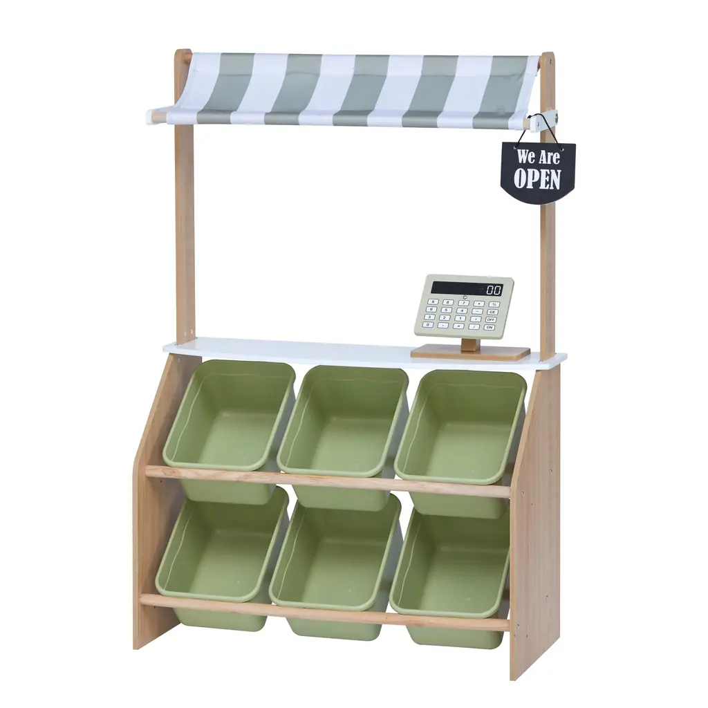 It's time for your little one to play around with this wooden supermarket toy set! With a checkout counter and a vending machine, this grocery store set brings kids a realistic supermarket role play experience. They can check out or write prices on the chalkboard. Besides, there are multiple storage shelves for kids to sort out lots of groceries, which is great for cultivating a good habit of organizing. What’s more, it also helps to develop their fine motor skills, hand-eye coordination, creativity and imagination. FeaturesInteractive cashier brings kids hours of fun Realistic vending machine for kids to pretend to select and purchase as well as take out the food or drinks 13 sweet accessories for kids to play 3 open shelves, 2 display racks and 1 door cabinet for enough storage space Round corners and burr-free edges for safe touch ASTM and CPSIA certifications for excellent security Ideal for kids’ hands-on ability, hand-eye coordination, creativity and imagination Magnetic catch for convenient closing Handy handles help kids open the doorColor: Green Material: MDF + Solid Wood Overall Dimension: 35" x 22.5" x 31.5" (L x W x H) Countertop Height: 19.5" Applicable Age: 3-8 Years Old Applicable Kids Height: 27.5"-51" Net Weight: 39.5 lbs Package includes: 1 x Kids Grocery Store Playset 2 x Canned Drinks 1 x Strawberry Jam 1 x Banana Juice 1 x Blueberry Juice 1 x Raspberry Juice 1 x Mango Juice 1 x Coconut Juice 1 x Biscuit 1 x Sweet 1 x Doughnut 1 x Sausage 1 x French Fries 1 x Instruction