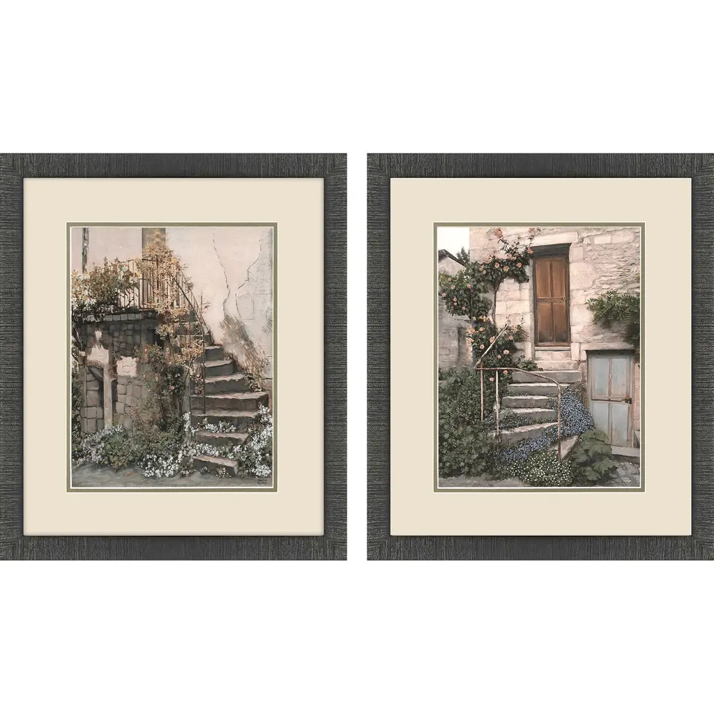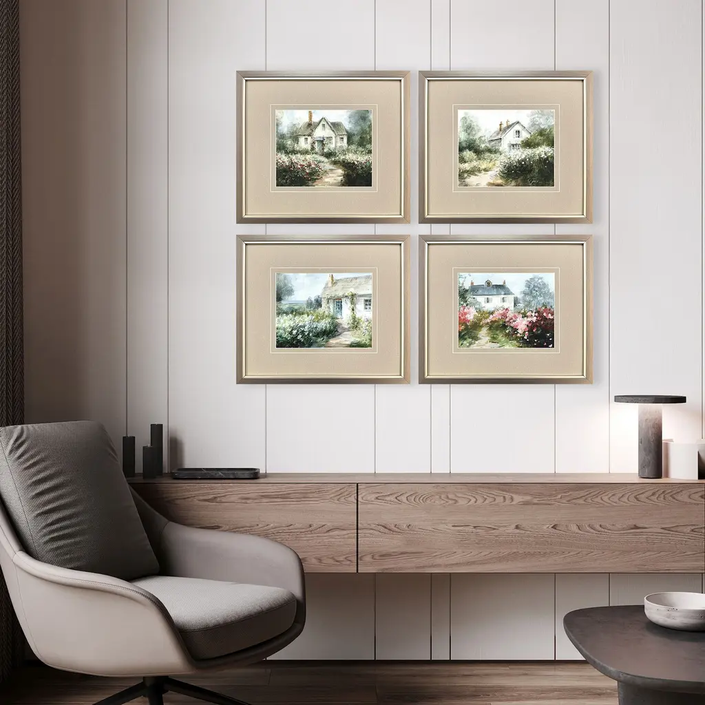 European cottages are enriched with lavish floral gardens. Featuring premium matting and framed in a brushed pewter molding with silver lip.