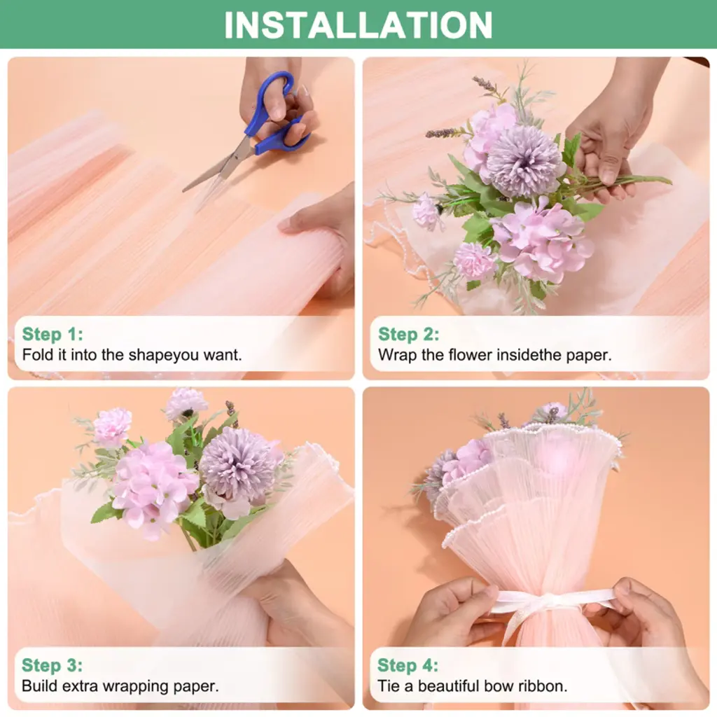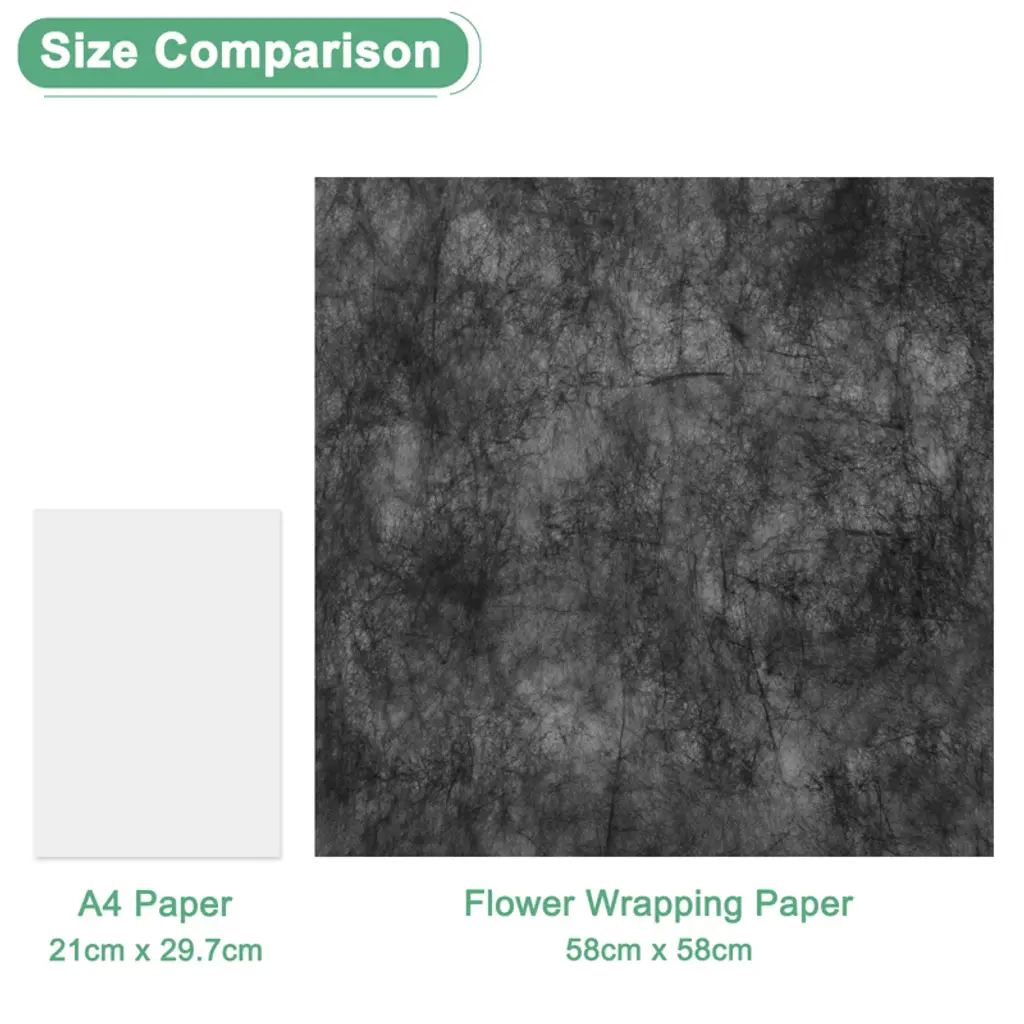 Florists and DIY enthusiasts often use this flower wrapping paper to wrap and present bouquets, and gifts. Crafted from cotton paper, this soft floral wrapping paper adds a delicate feel to any floral design. Its flexibility allows for various creative folding and wrapping techniques. Can be cut and the translucent design does not hide the color of the flowers. This flower wrapping paper offers versatility in creating beautiful floral presentations. The waterproof feature ensures that the paper protects the bouquet from moisture and maintains its freshness. When using floral wrapping paper, you should be careful to avoid tearing or wrinkling. Ensure proper cutting tools and keep the wrapped bouquets away from direct sunlight or water exposure to preserve beauty.