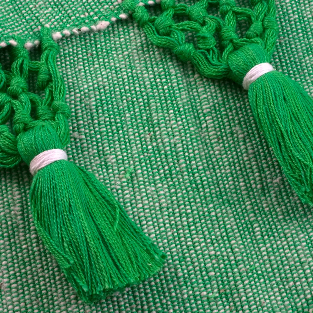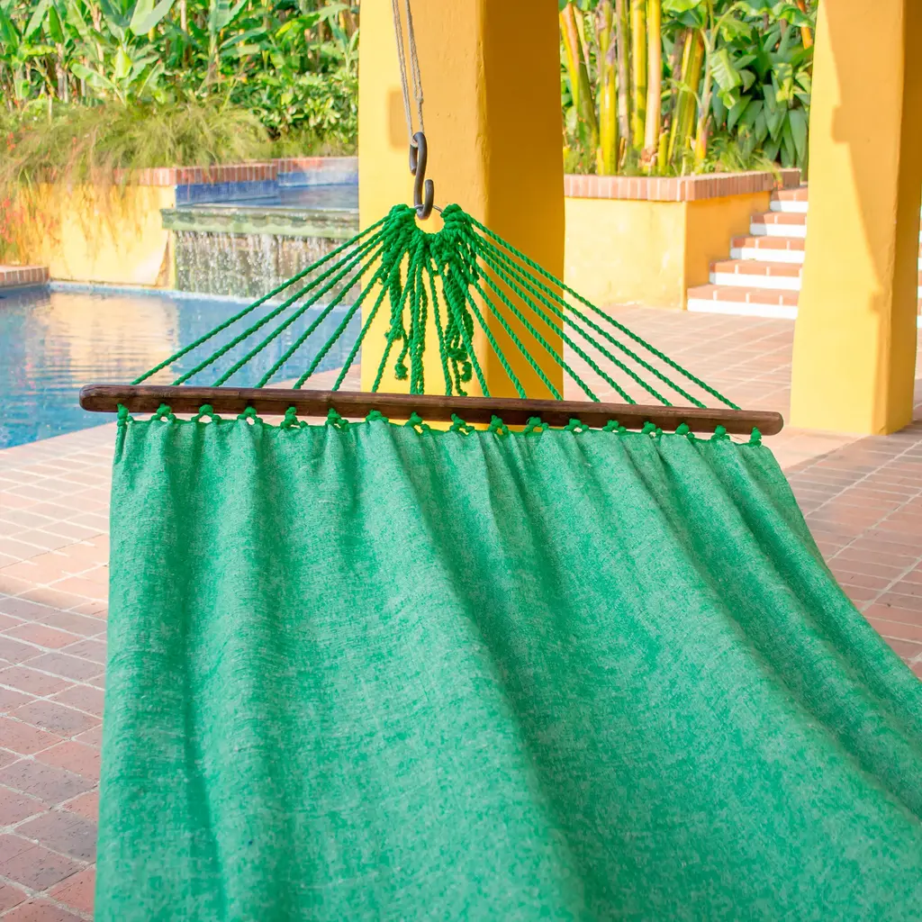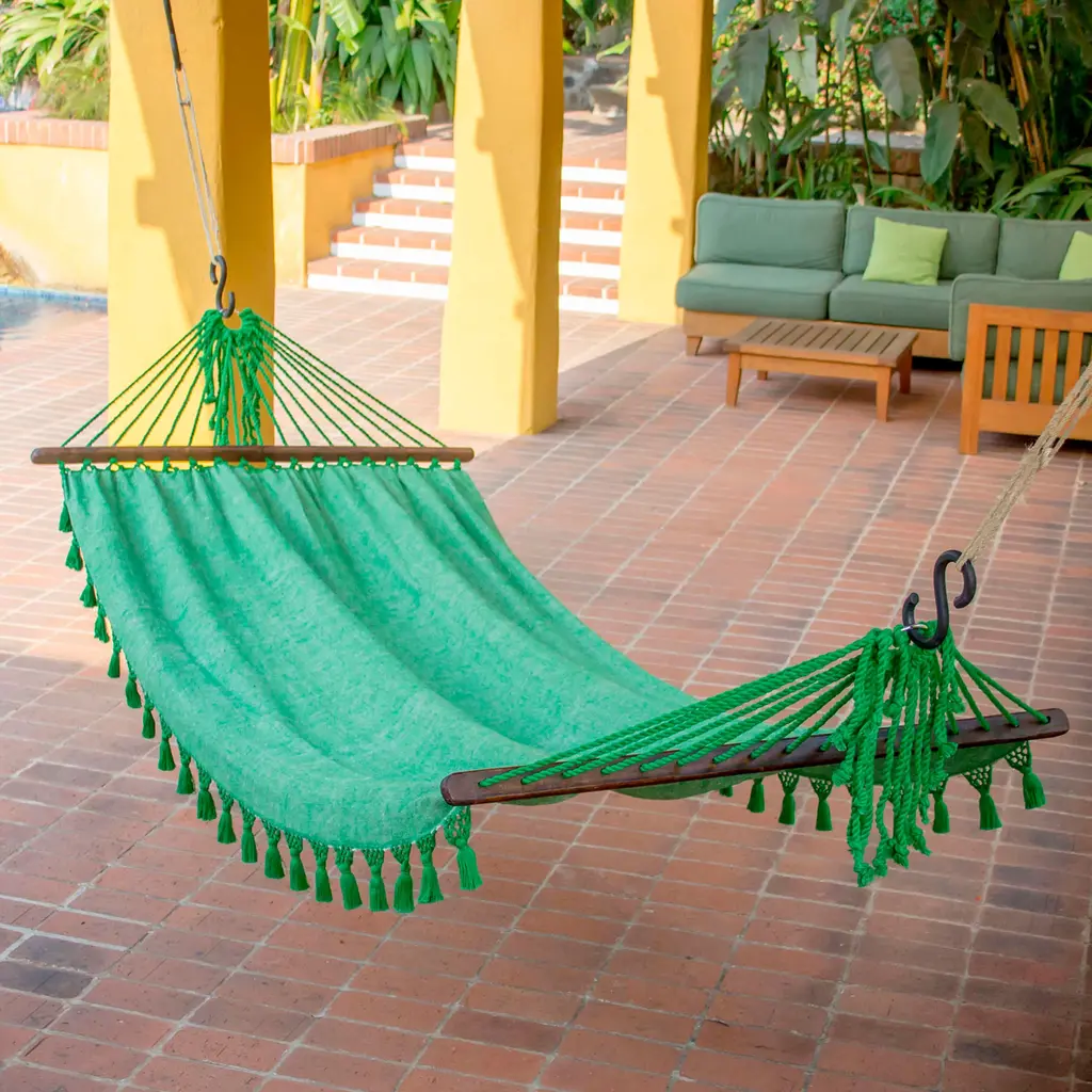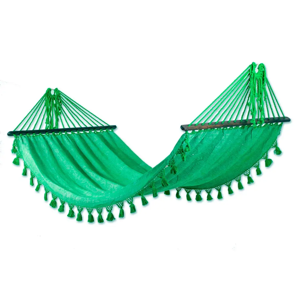 Woven of cool cotton on a pedal loom, this green and ivory hammock holds the promise of sweet relaxation. Estuardo Cofino designs the inviting hammock, which is finished by hand with crocheted borders that end with flirty pompoms. The hammock features pinewood spreader bars and silver-hued brass hoops within the hanging loops.