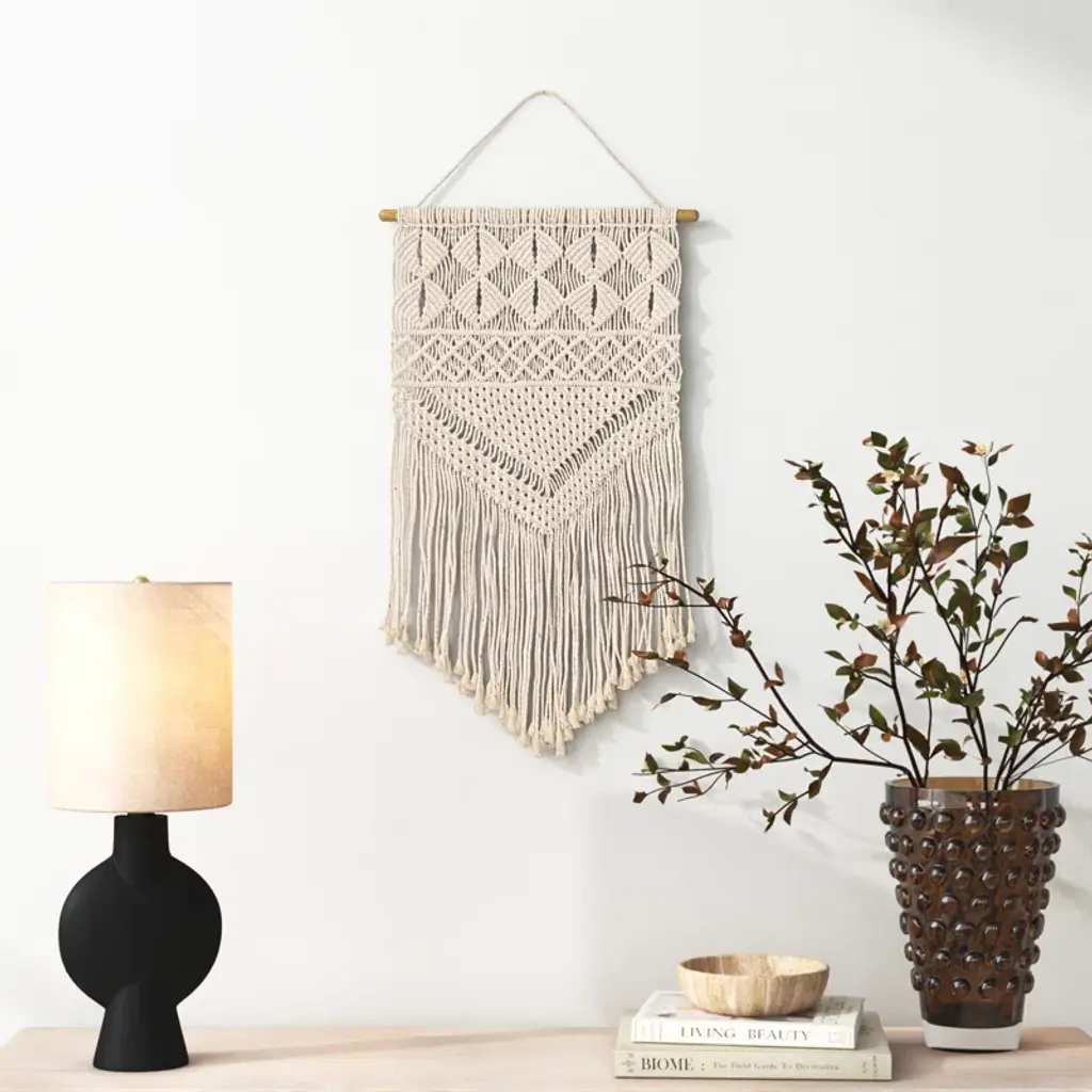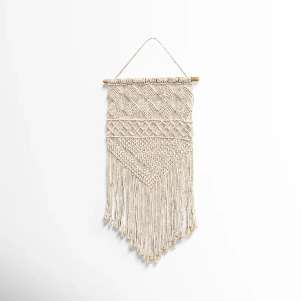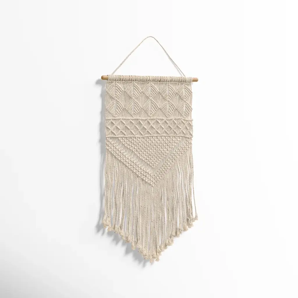 This wall hanging will help fashion a strong sense of charm in your home! The macrame construction of these wall hangings offers a natural textured and intricate look that will help create an inviting and captivating sense of style within your decor space. Crafted from 100% cotton, and features fringe accents. For optimal product care wipe clean with a dry cloth.