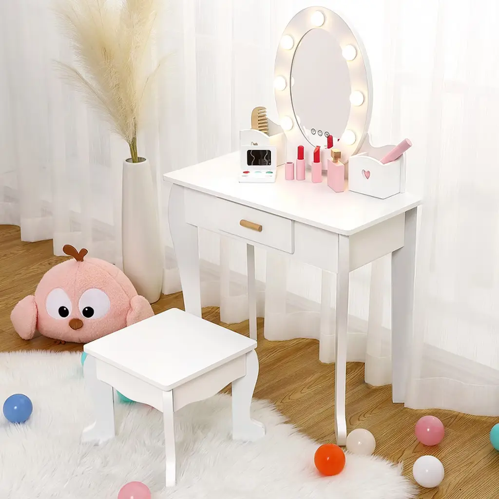 This girls' vanity set is tailored for 4-9 yr princesses, with a kid-friendly size (vanity:37"Hx23.6"Lx11.8"W; stool:10.2"Hx11.4"Lx11.4"W) that fits small spaces and matches kids’ height. Made of durable MDF with round edges, it meets CPSIA safety standards—no sharp parts, ensuring worry-free play.The complete set includes a vanity, stool, and wood makeup play kit, letting kids experiment with looks while building independence. It works in living rooms, bedrooms, or playrooms, offering educational fun that supports cognitive and emotional development.With detailed instructions for easy adult assembly and guaranteed support for issues, it’s also a perfect birthday/Christmas gift. This "Girls' Vanity Set for Kids" blends safety, fun, and practicality—creating magical grooming moments for little ones.