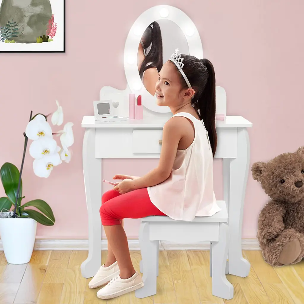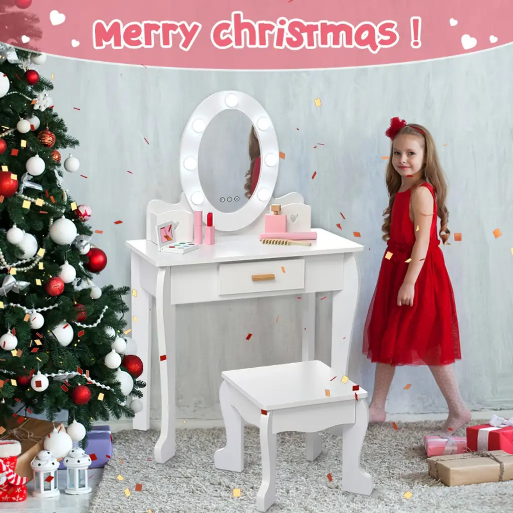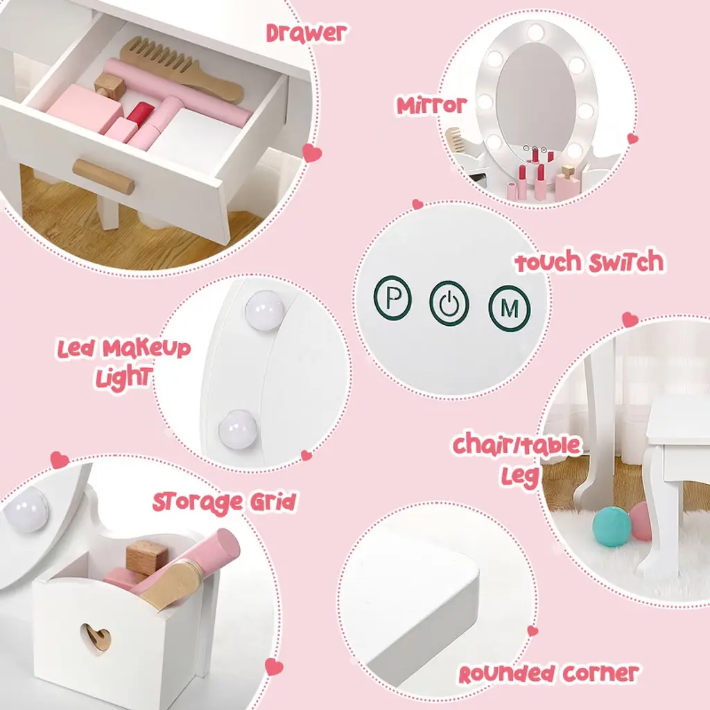 Coucheta Kids Vanity Set With Lighted Mirror & Stool, Toddler Vanity Table And Chair Set, Wooden Makeup Playset, Makeup Table And Stool For Girls