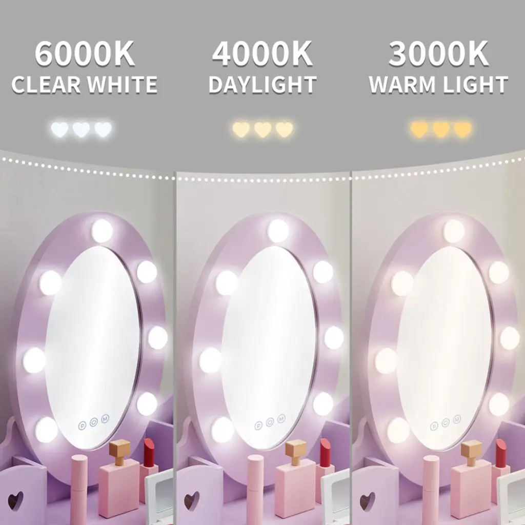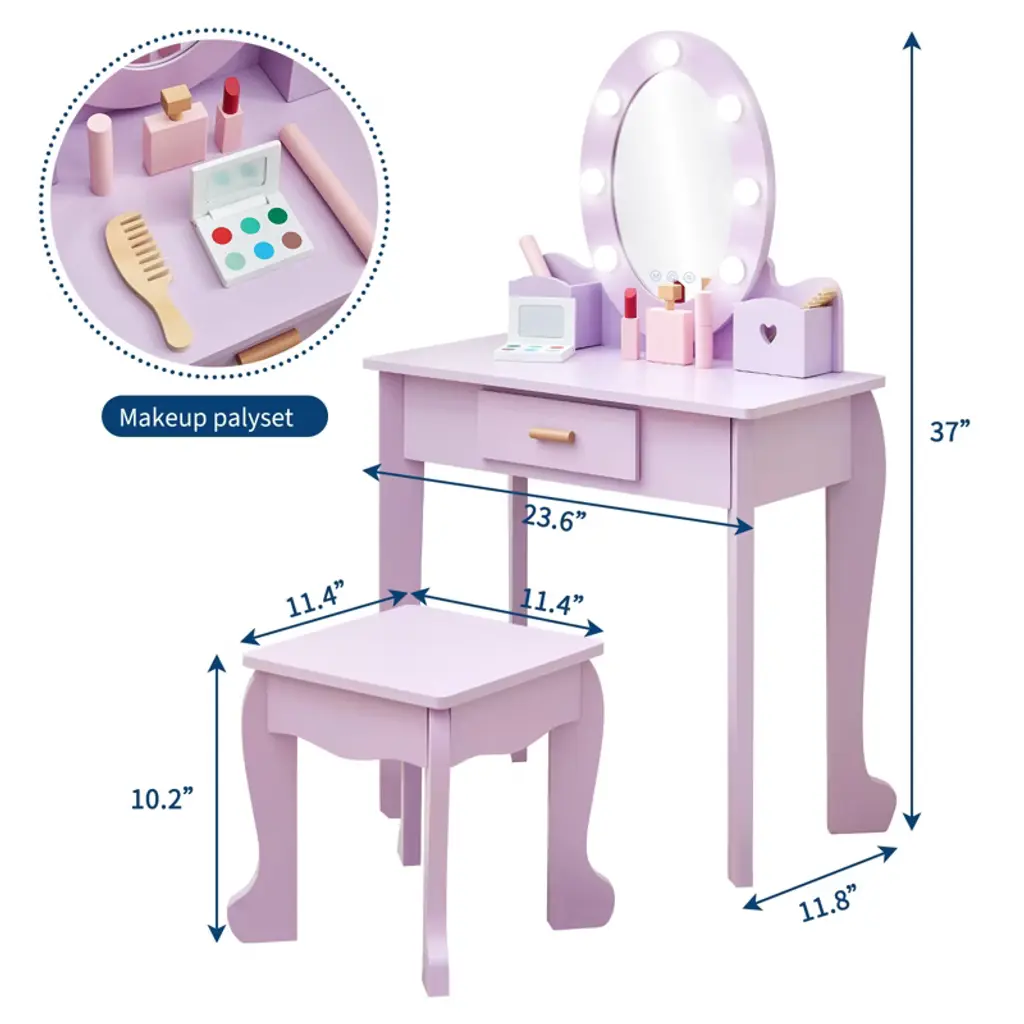 This girls' vanity set is tailored for 4-9 yr princesses, with a kid-friendly size (vanity:37"Hx23.6"Lx11.8"W; stool:10.2"Hx11.4"Lx11.4"W) that fits small spaces and matches kids’ height. Made of durable MDF with round edges, it meets CPSIA safety standards—no sharp parts, ensuring worry-free play.The complete set includes a vanity, stool, and wood makeup play kit, letting kids experiment with looks while building independence. It works in living rooms, bedrooms, or playrooms, offering educational fun that supports cognitive and emotional development.With detailed instructions for easy adult assembly and guaranteed support for issues, it’s also a perfect birthday/Christmas gift. This "Girls' Vanity Set for Kids" blends safety, fun, and practicality—creating magical grooming moments for little ones.