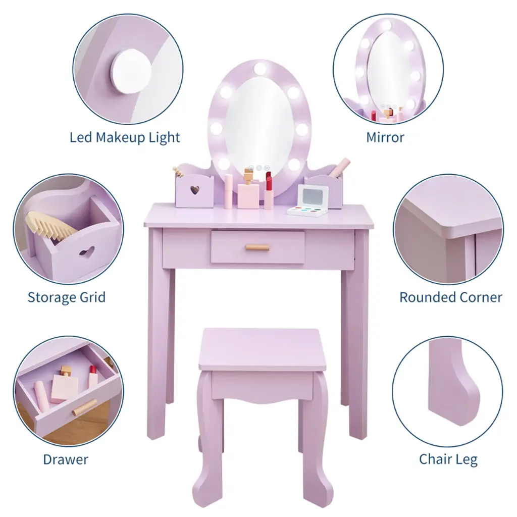 Coucheta Kids Vanity Set With Lighted Mirror & Stool, Toddler Vanity Table And Chair Set, Wooden Makeup Playset, Makeup Table And Stool For Girls