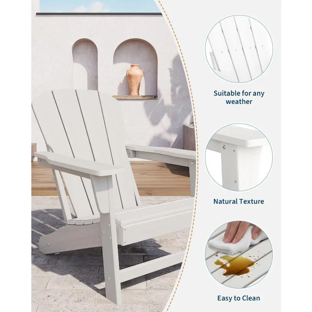 This outdoor Adirondack chair features a textured finish that mimics real wood grain, blending elegance with low-maintenance durability—perfect for enhancing your garden, deck, or outdoor lounge space.Featuring a functional 2-tier structure, this Adirondack table offers ample space for drinks, snacks, books, or décor. It’s the ideal companion to your Adirondack chair, offering both convenience and style for your outdoor lounging setup. Unlike wood, this Adirondack chair plastic outdoor option won't crack, fade, or peel—making it ideal for year-round use on your patio, lawn, or backyard.