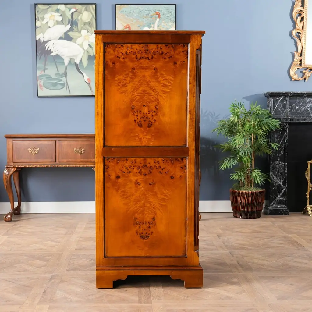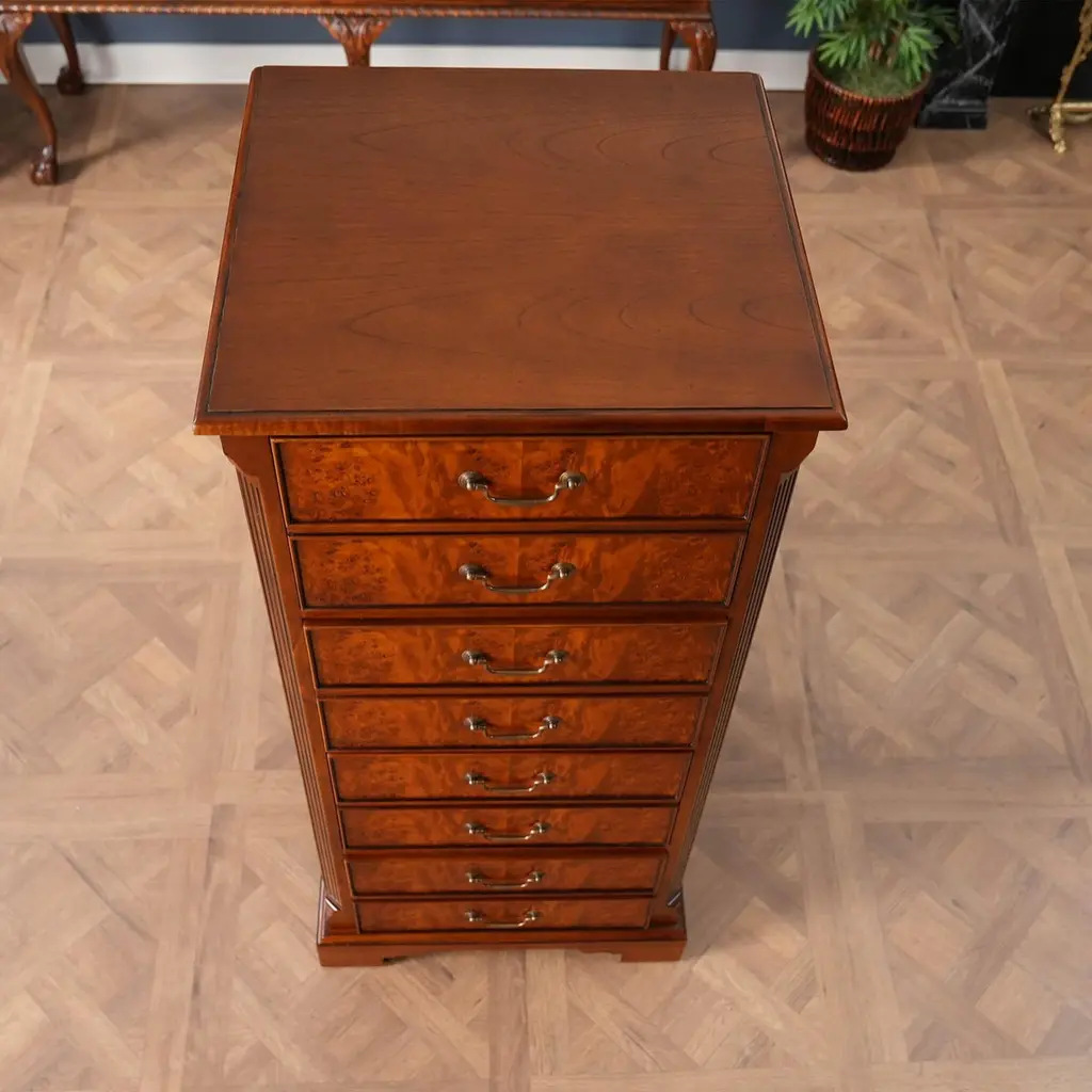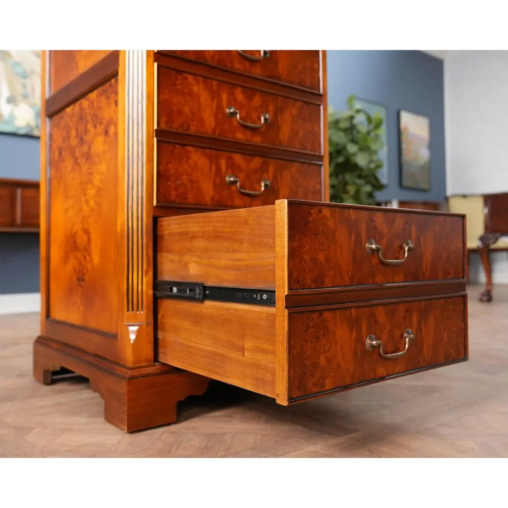 A superb piece of craftsmanship this high quality Country Estate Four Drawer File from Niagara Furniture is made with figured burled wood. The edge of the top is a lovely shaped solid wooden molding. In the front are eight faux drawers, each having applied moldings and displaying lovely matched burled veneers. Each drawer has solid brass handles and the eight drawer fronts open as four large hanging file drawers. The side of our Country Estate Four Drawer File Tall is also decorated using high quality figured burled veneers as well as solid wooden moldings. This cabinet matches many other items in our Niagara Country Estate Office collection, please see the related products link below for details.Cabinet Measures approximately 25 inches wide x 24 inches deep x 57 inches high