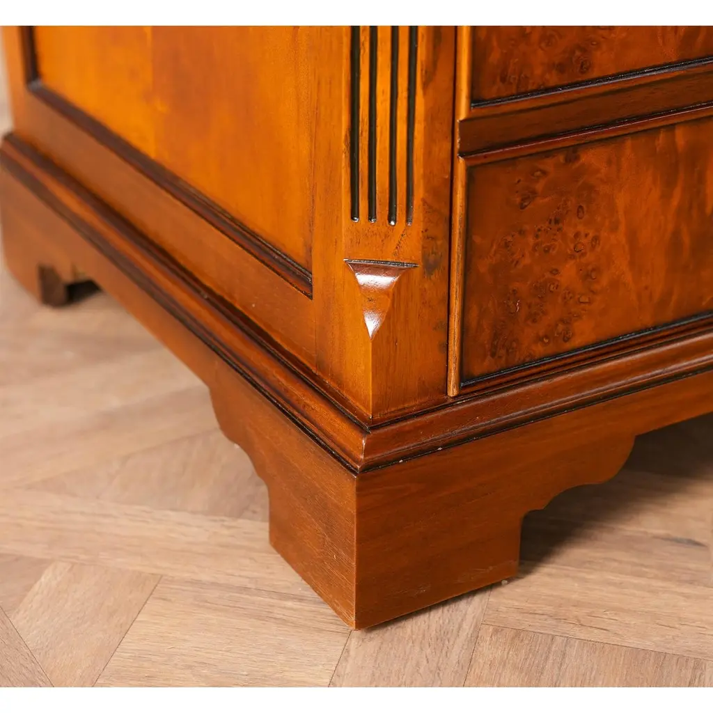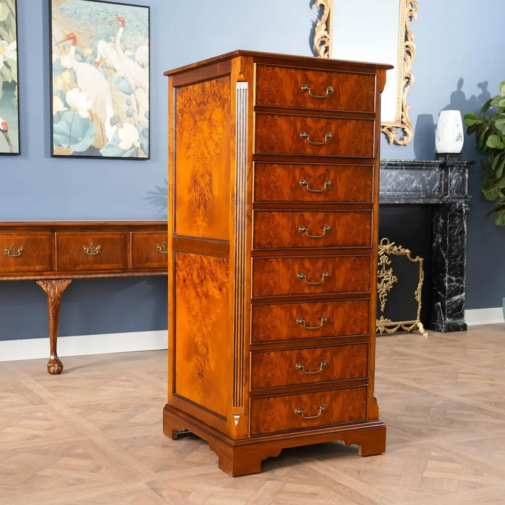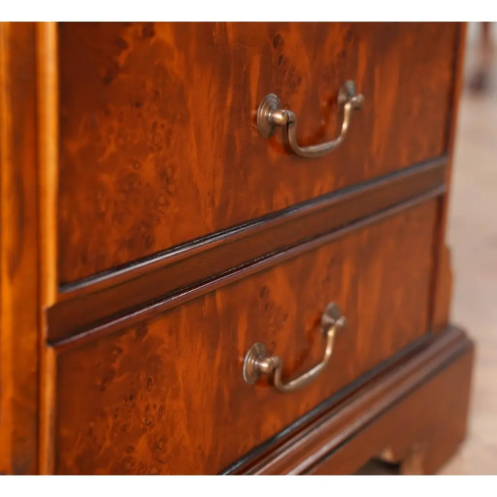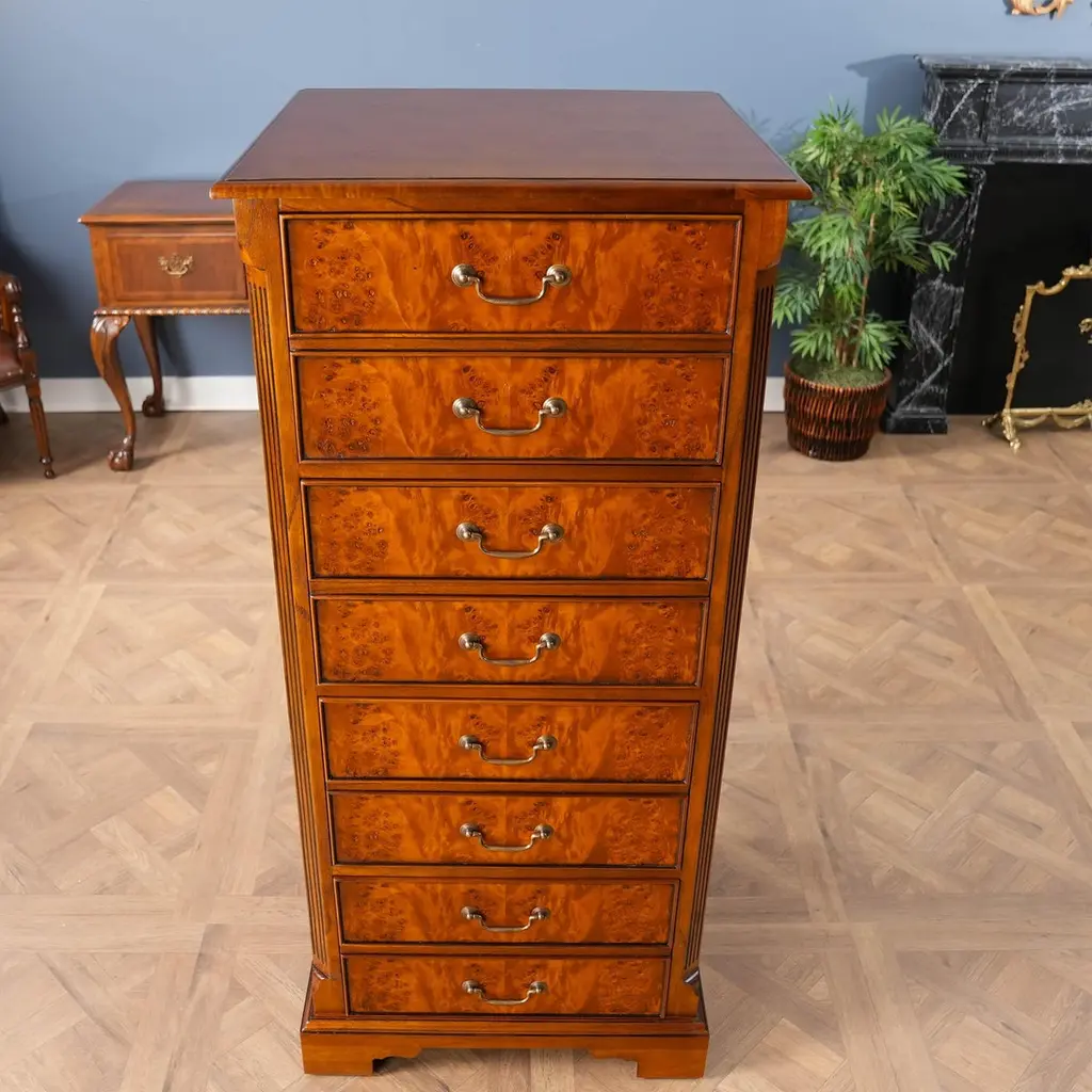 A superb piece of craftsmanship this high quality Country Estate Four Drawer File from Niagara Furniture is made with figured burled wood. The edge of the top is a lovely shaped solid wooden molding. In the front are eight faux drawers, each having applied moldings and displaying lovely matched burled veneers. Each drawer has solid brass handles and the eight drawer fronts open as four large hanging file drawers. The side of our Country Estate Four Drawer File Tall is also decorated using high quality figured burled veneers as well as solid wooden moldings. This cabinet matches many other items in our Niagara Country Estate Office collection, please see the related products link below for details.Cabinet Measures approximately 25 inches wide x 24 inches deep x 57 inches high