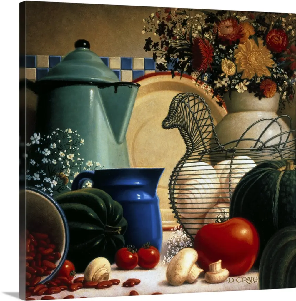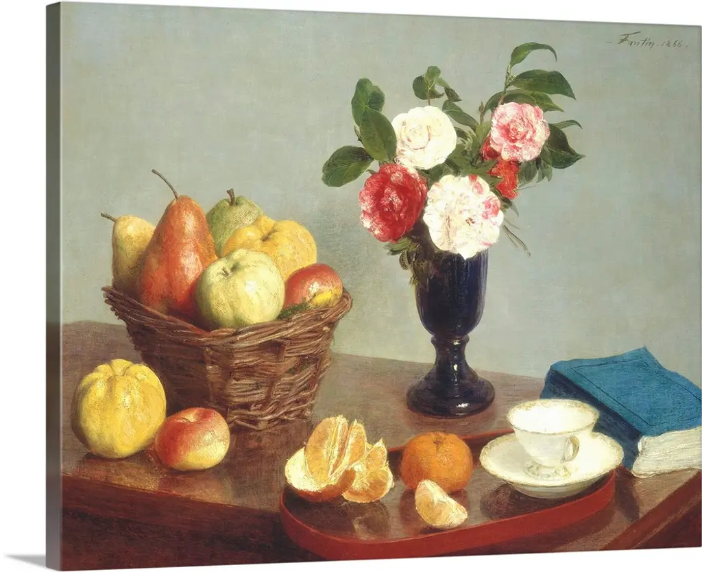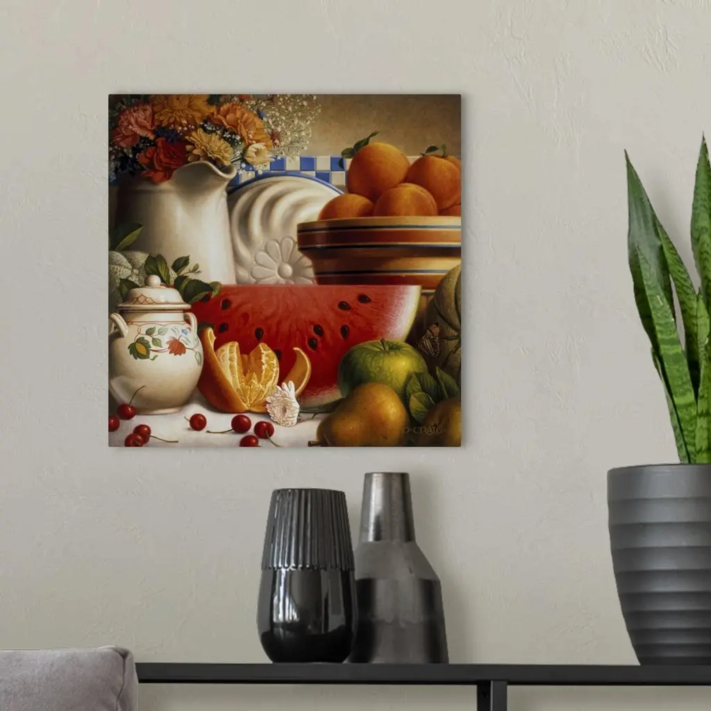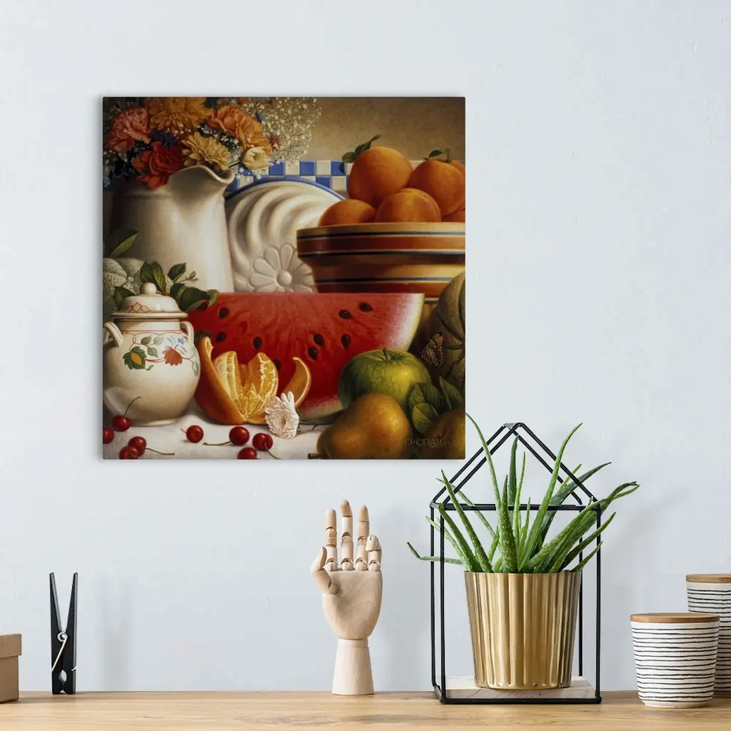 Pitcher of flowers, bowl of peaches and some watermelon and other fruit on a table.