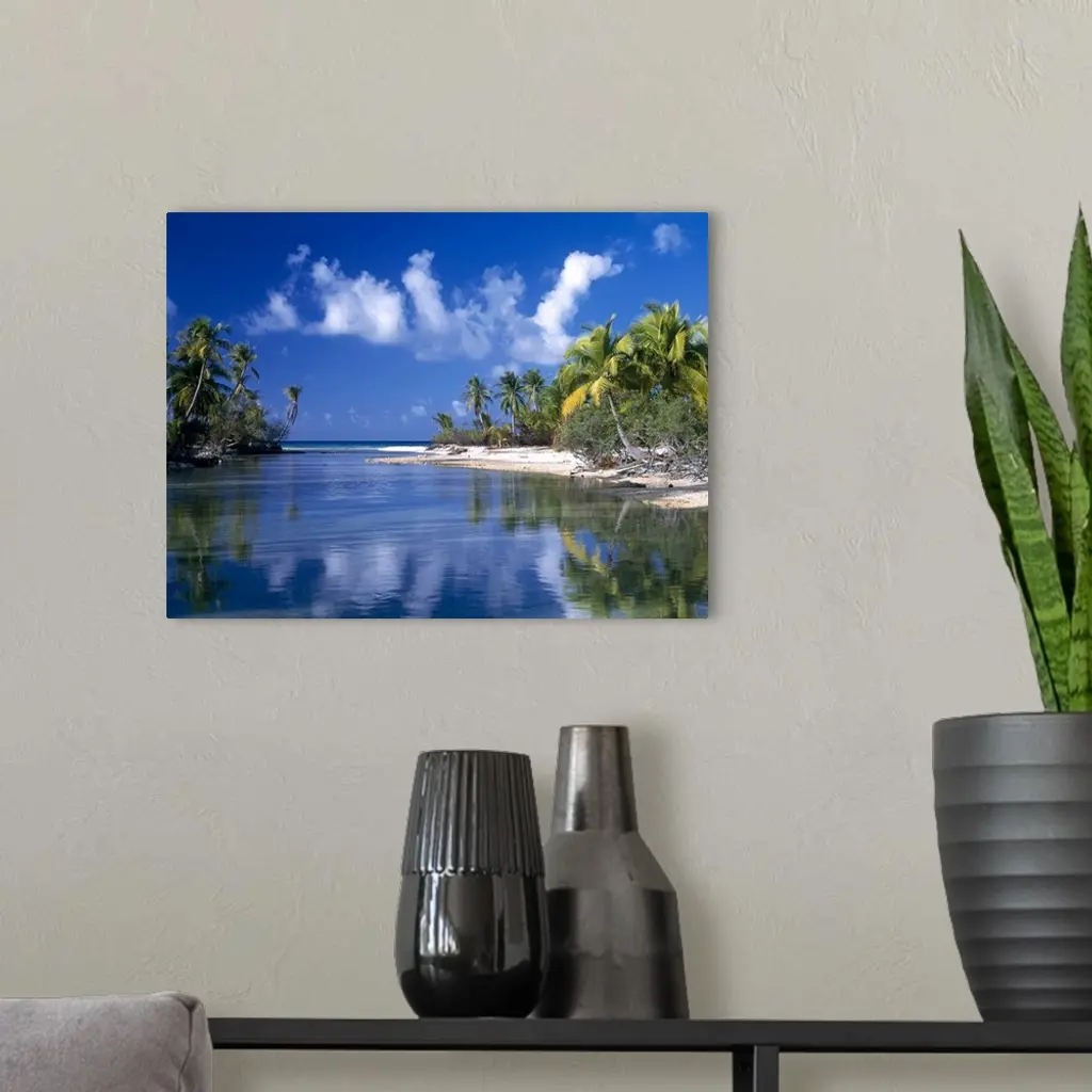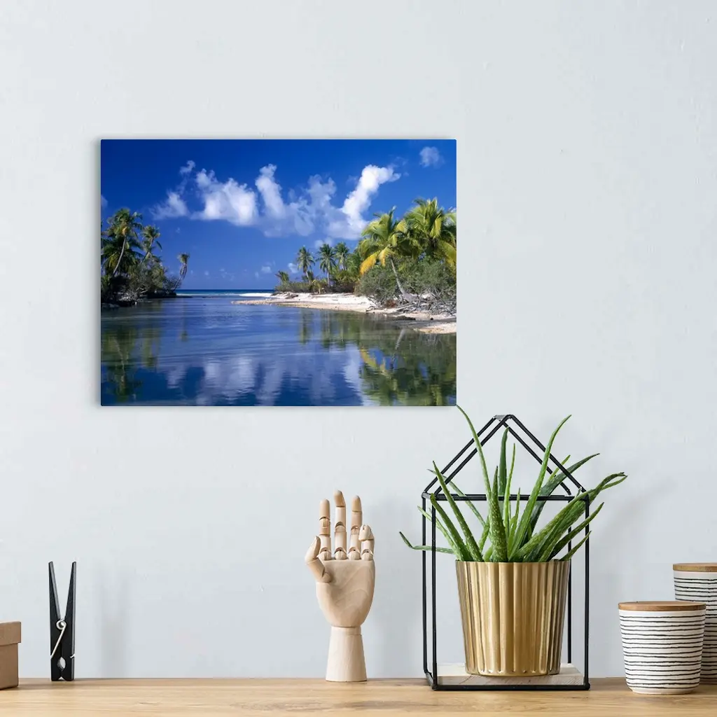 Photograph of lagoon on a cloudy day with beaches on both sides. The sandy beaches are covered in palm trees that are reflected in the water.
