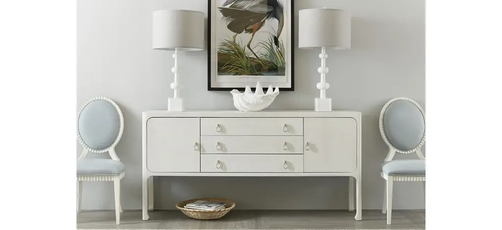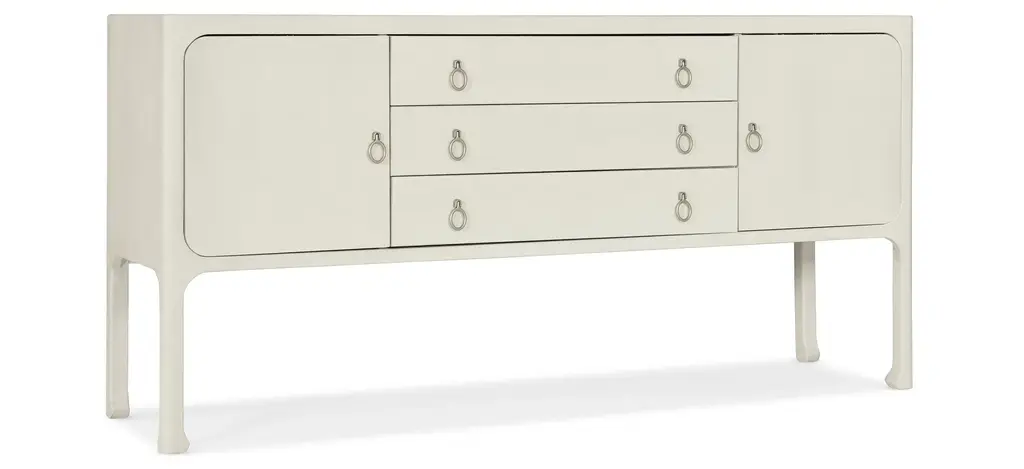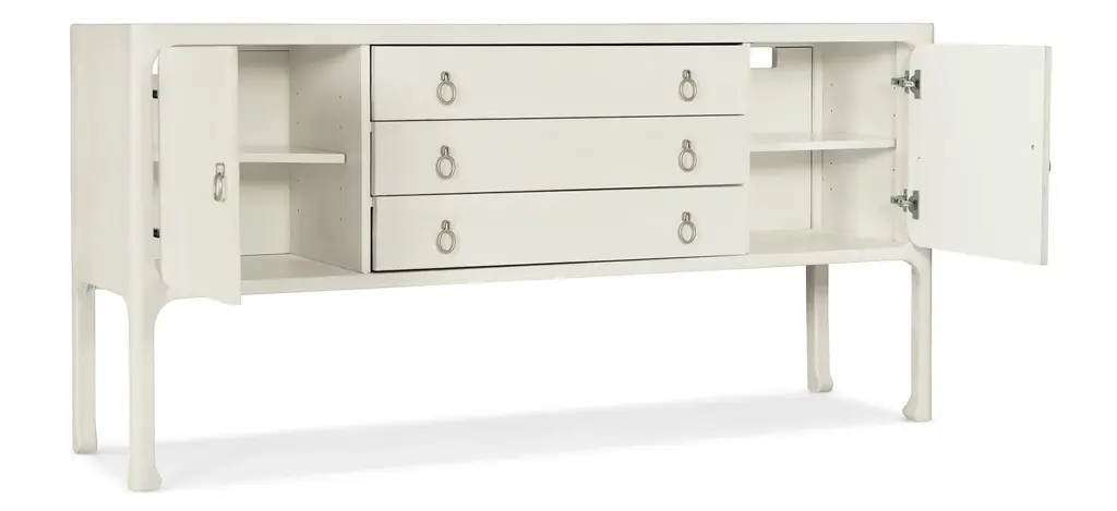 Designed to create a comfortable and inviting retreat within the home, the Cove Shore Server is defined by its casual finishes and variety of organic textures and materials that combine to deliver a relaxed aesthetic. Inspired by casual, waterfront living, the collection was designed to bring the relaxed aura of the outside in. White oak veneer delivers two key finishes, a whitewashed look and a weathered gray and is accented with sand blasted pine and soft white bronze metal details. Hooker Furniture offers full height, full depth and full width drawers for maximum storage capacity. All drawers have strong, time-tested English or French dovetail construction, for years of problem-free use.