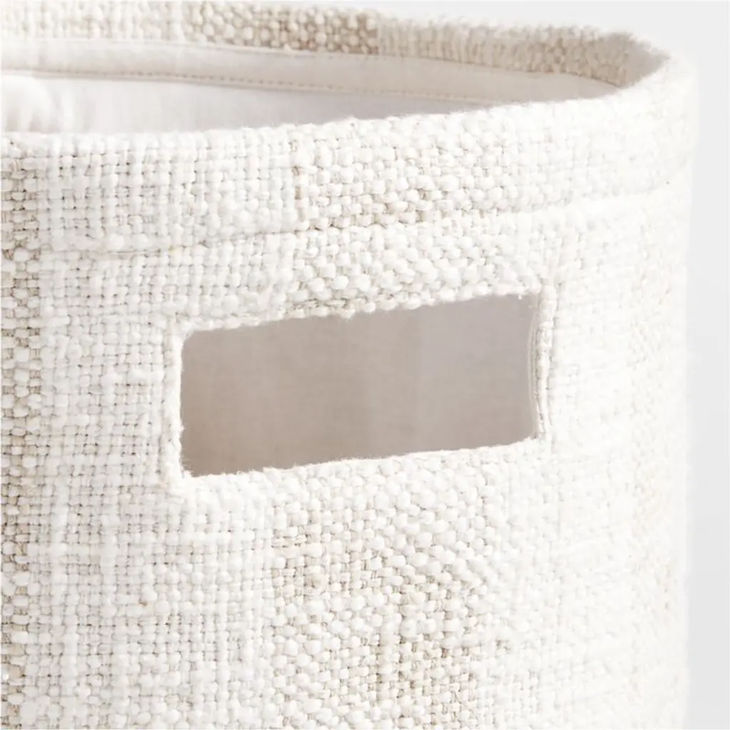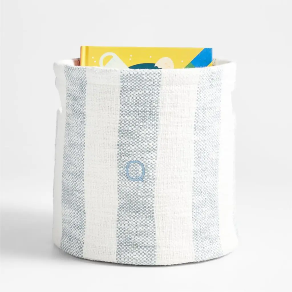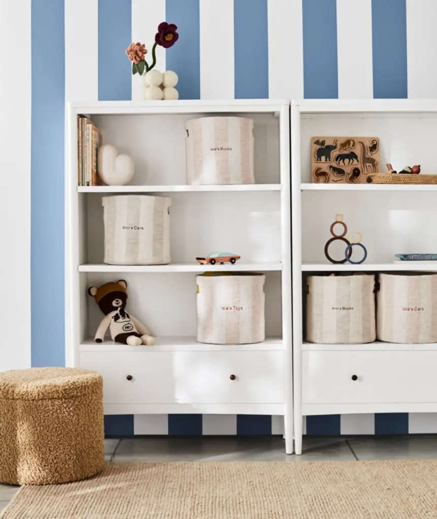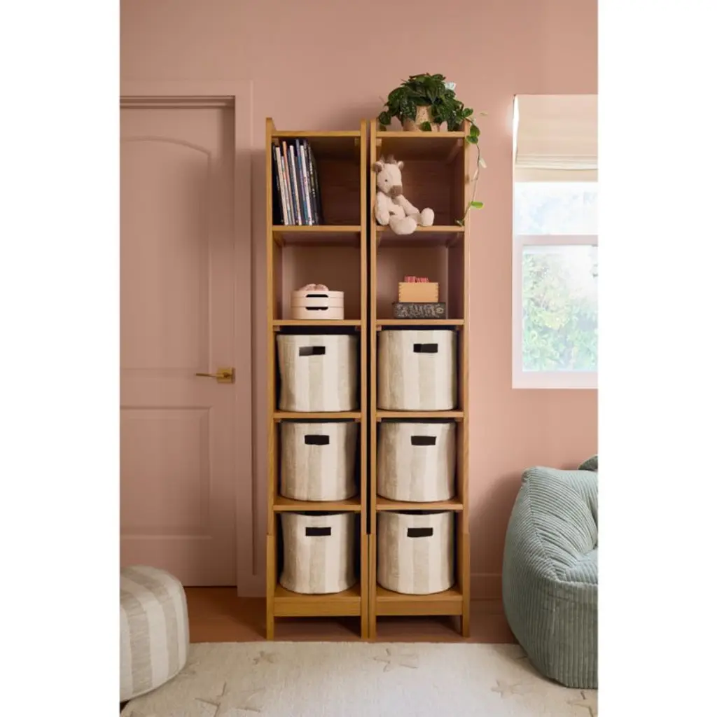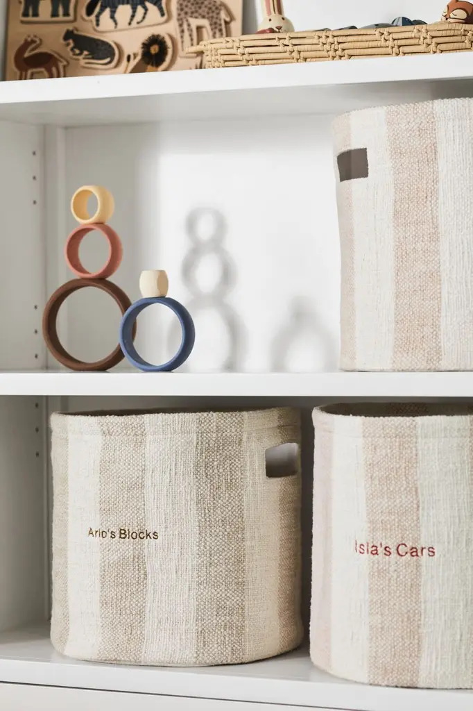 Our soft tan and white striped Cove shelf storage bin offers a stylish way to keep kids' rooms tidy and organized. The organic brushed cotton container adds a fresh, playful touch to a kid's bedroom or playroom with its wide textured stripes and neat cutout handles that make it easy to tote around.