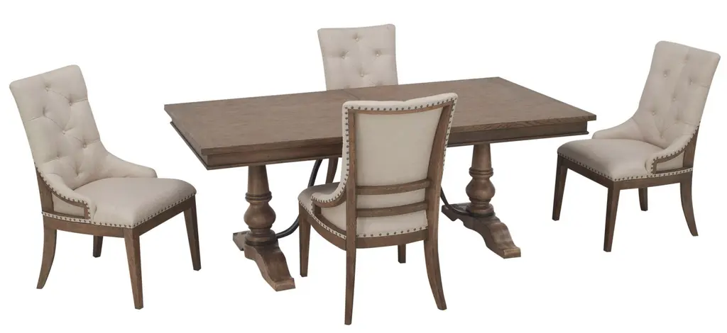The Coventry 5-pc Dining Set is the stylish dining solution for any farmhouse style. This set features a dining table with extension leaf as well as upholstered side chairs for ultimate comfort. Matching Table Protector