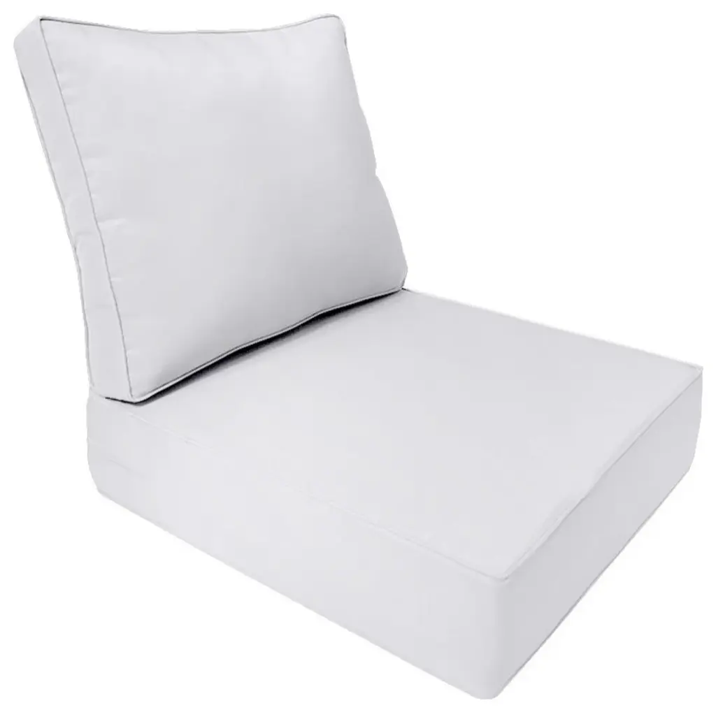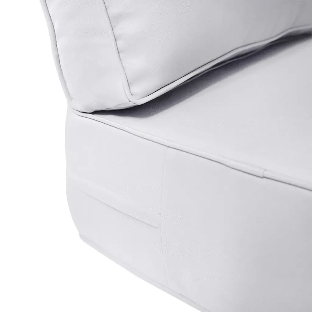 • Small Deep Seat & Back Cushion Pipe Trim SLIP COVER ONLY• COVER ONLY - INSERTS NOT INCLUDED• Cover Color: AD-105• Edge Trim: Pipe Edge (same color)• Seat Cover Dimension: A: 23"B: 24"C: 6"• Back Cover Dimension: D: 23" E: 19"• Fabric: 230 Gram Polyester Upholstery• Hidden Zipper• Water Repellent• • • NOT WATERPROOF• • • Tips: Please cover or store cushion pillow in rainy season• Cleaning: Soap clean and rinse off with water hose. Outdoor durable!• Quantity: 1