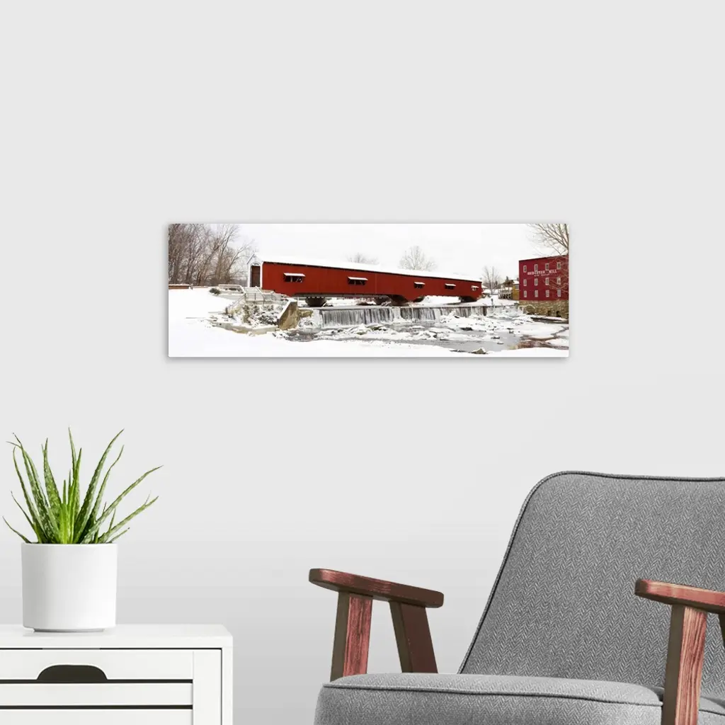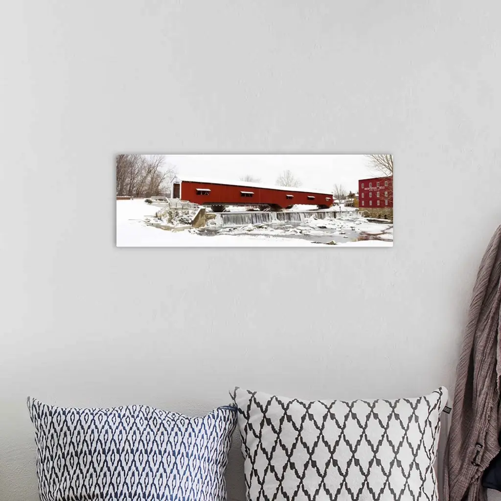 Covered bridge and mill in winter, Bridgeton Bridge Arson, Parke County, Indiana wall art for home and office decor. Discover canvas art prints, photos, mural, big canvas art and framed wall art in GreatBigCanvas.com's varied collections.