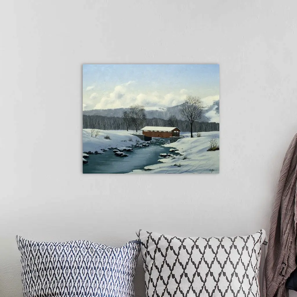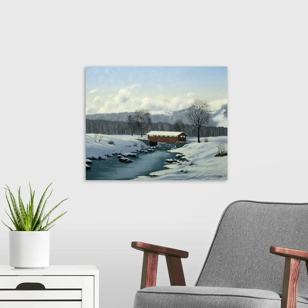 Contemporary painting of a covered bridge in a forest clearing after a heavy snowfall.