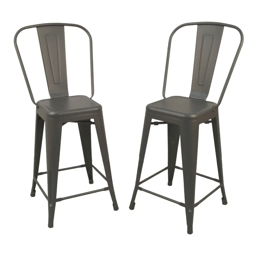 Made of powder-coated steel with a pewter finish, the timeless Covert counter stool features a tall split back, smooth square seat and stable tapered legs. Lightweight for easy transport from the kitchen to the dining room, this durable counter chair is reinforced with an X-brace beneath the seat to ensure lasting support. The versatile gray-blue hue of this counter-height stool complements traditional, modern and farmhouse furniture.