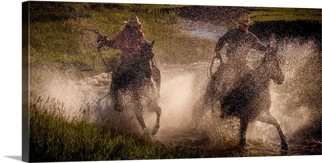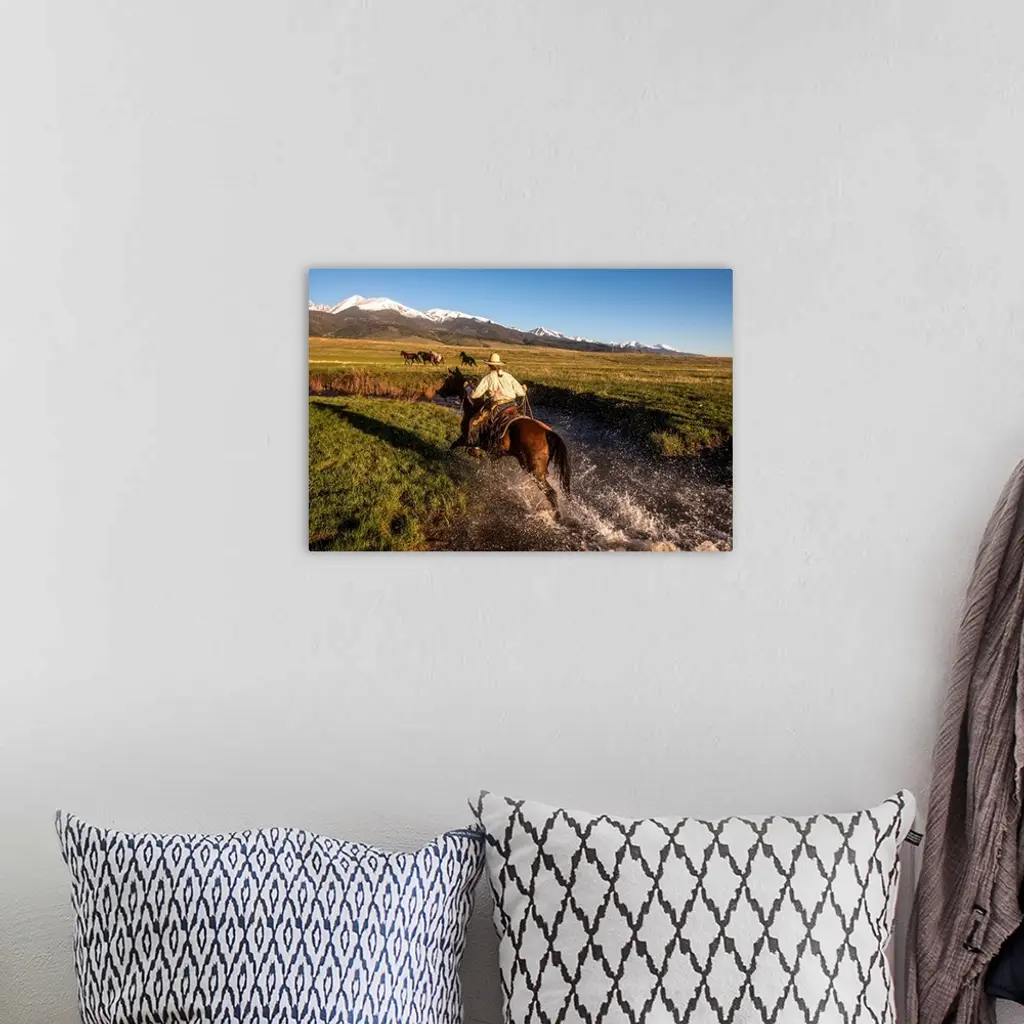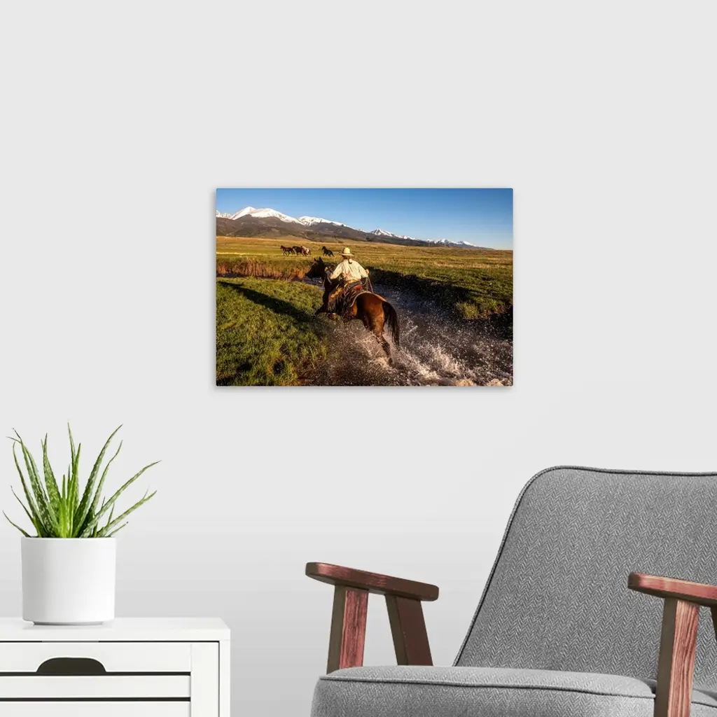 Action photograph of a cowgirl crossing a river on horseback with a herd of horses in front of her.