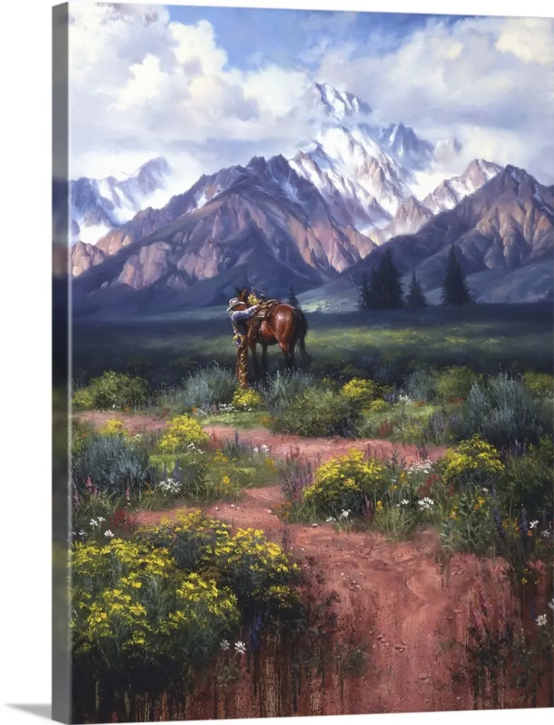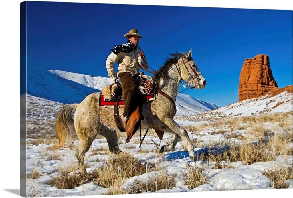Photograph of three people on horseback in a row with snow covered mountains in the background.