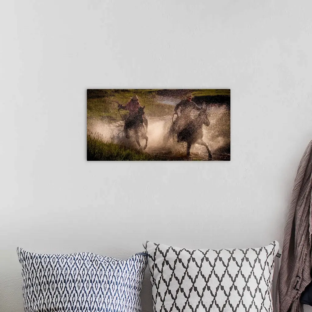 Photograph of two cowgirls splashing through a steam on horseback with their lassos out.
