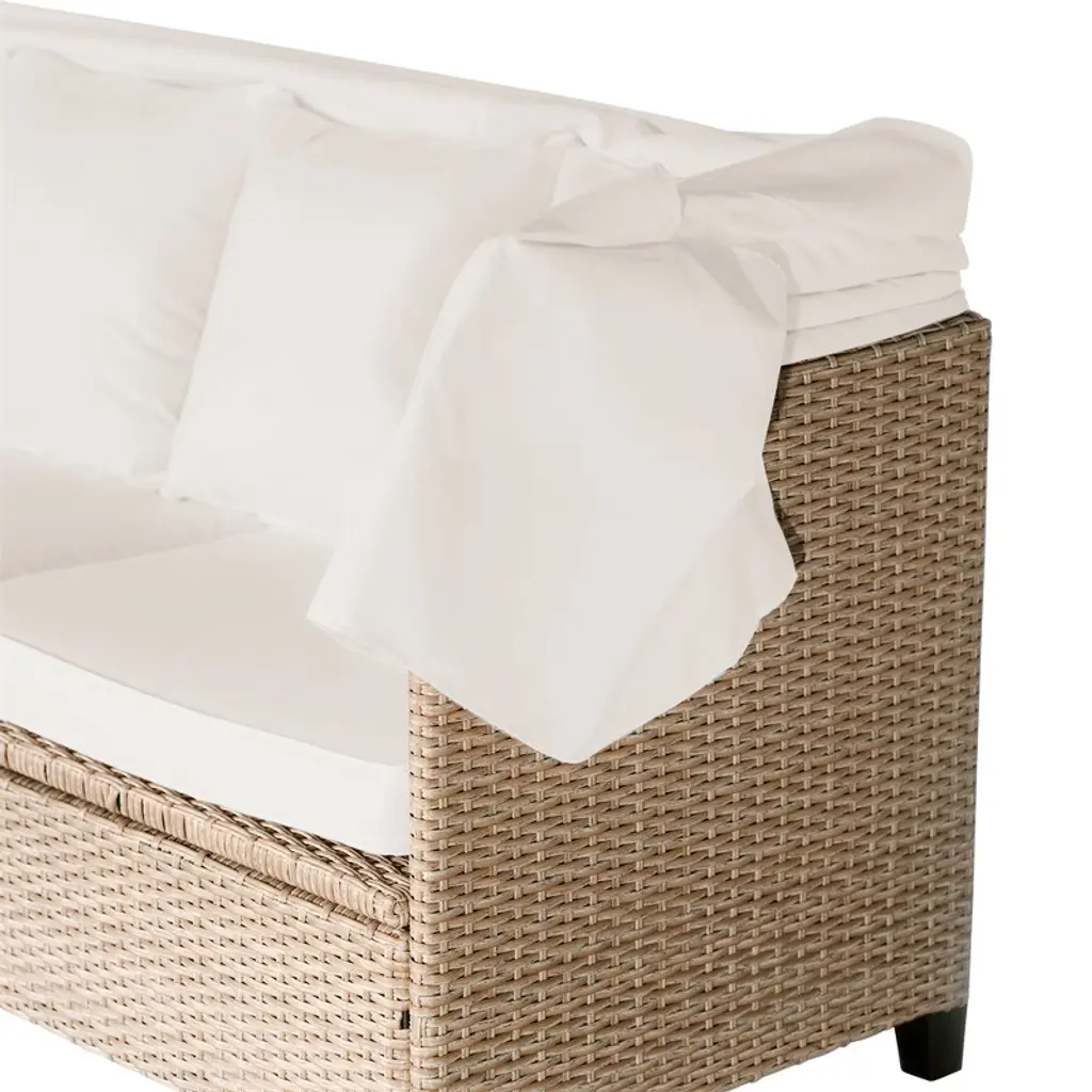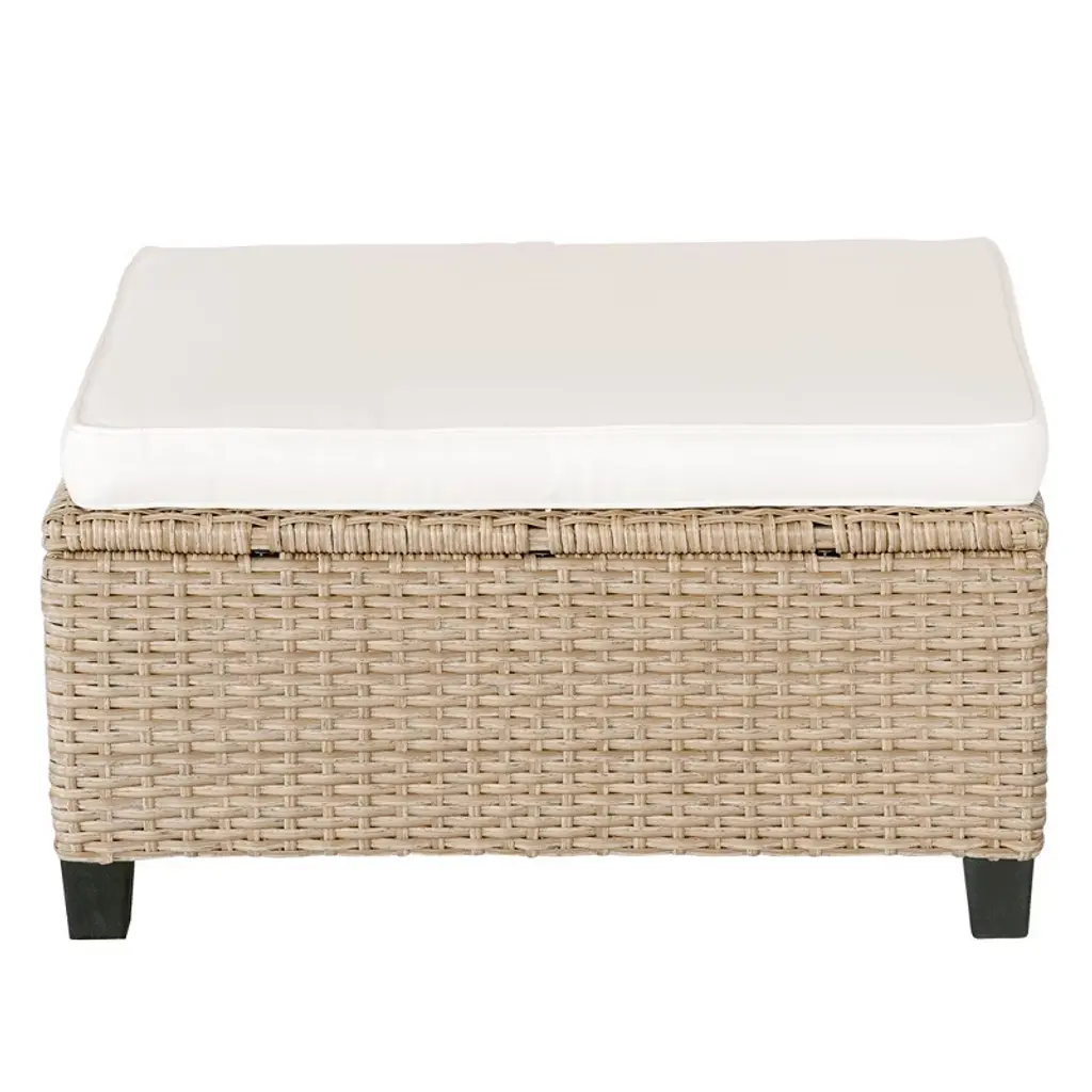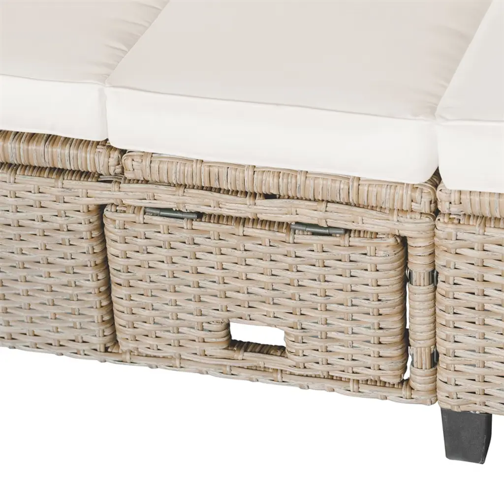 This compact 4-piece set includes a 3-position reclining sofa and 3 multi-functional ottomans (convertible to table). The innovative nesting design allows tables to store neatly under the sofa, perfect for small balconies or patios. The timeless woven wicker pattern maintains elegance while maximizing limited outdoor areas.