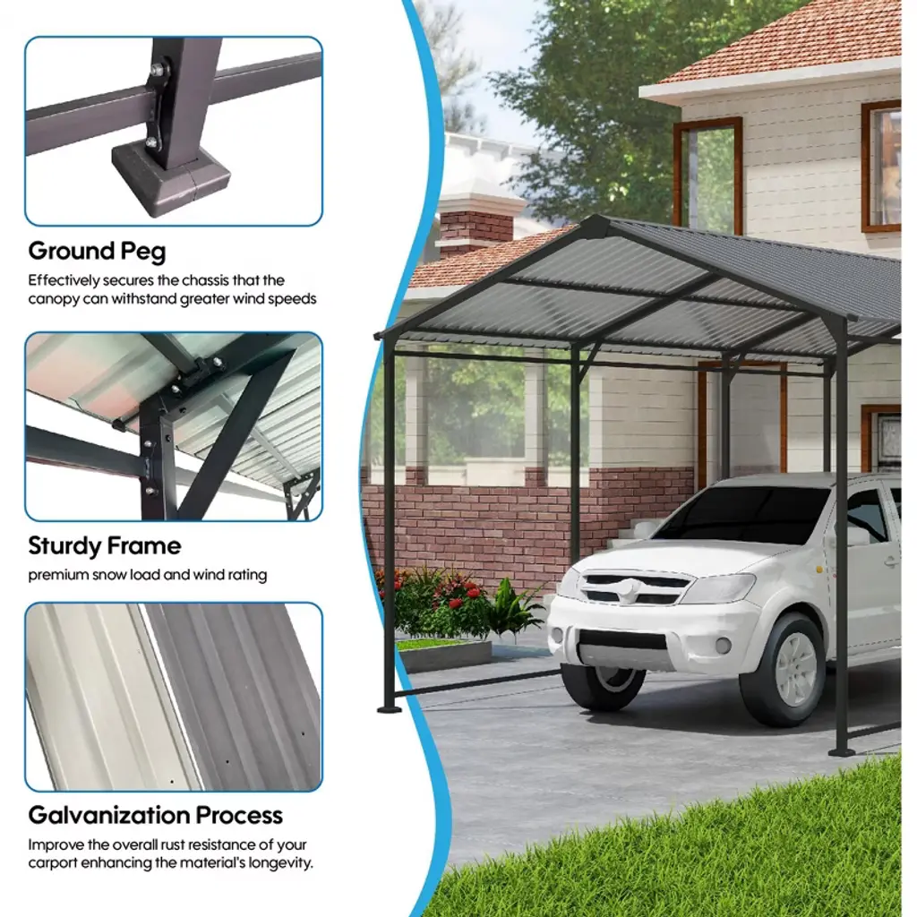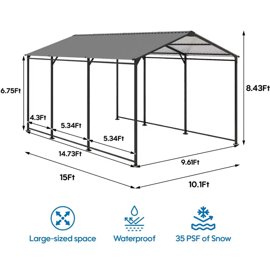 This 10x15 FT heavy-duty metal carport features a galvanized steel frame and corrugated steel roof for superior durability and rust resistance. It provides shelter for vehicles, boats, and trucks, with a wind rating of 100 MPH and snow load capacity of 10 PSF. Ideal for outdoor storage or events, it offers long-lasting protection from the elements.