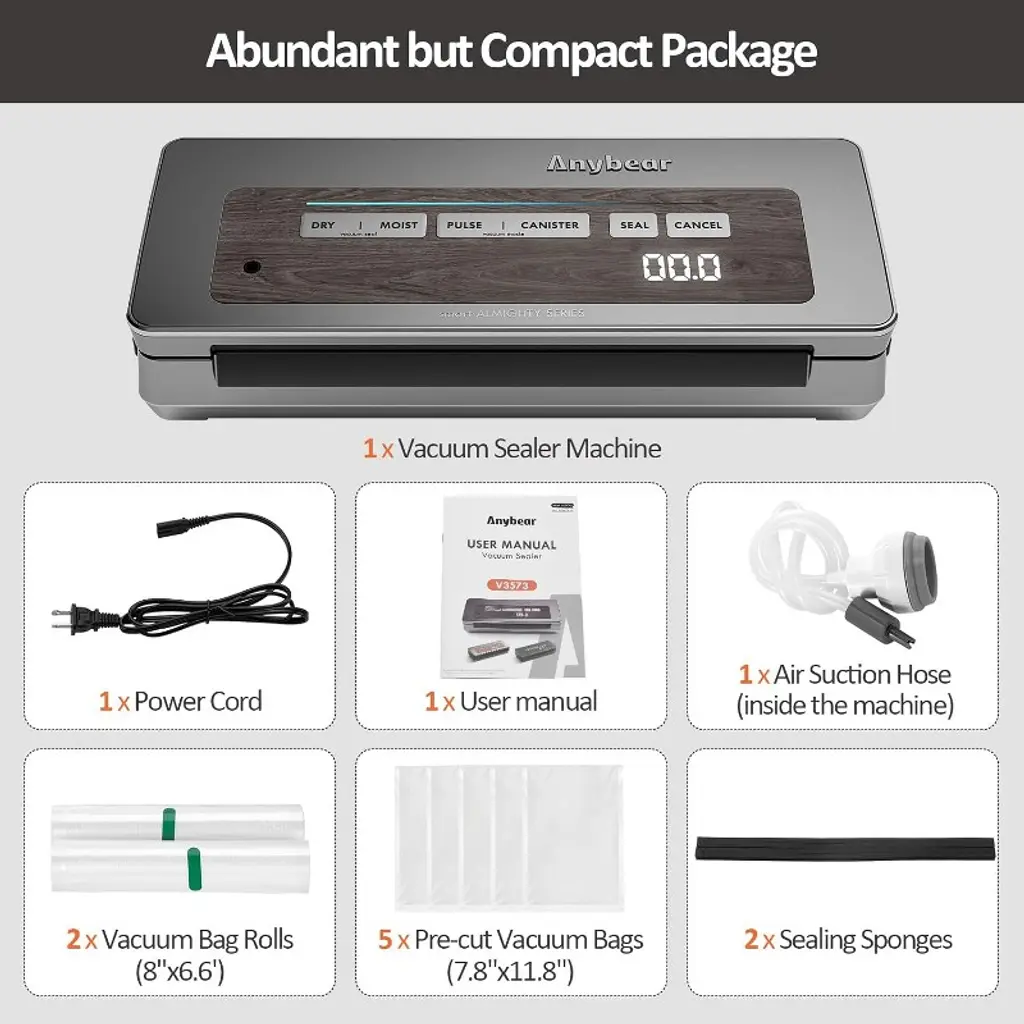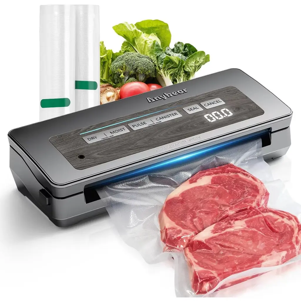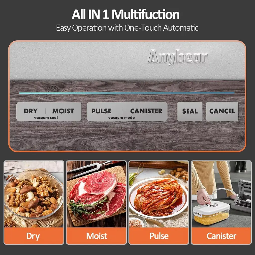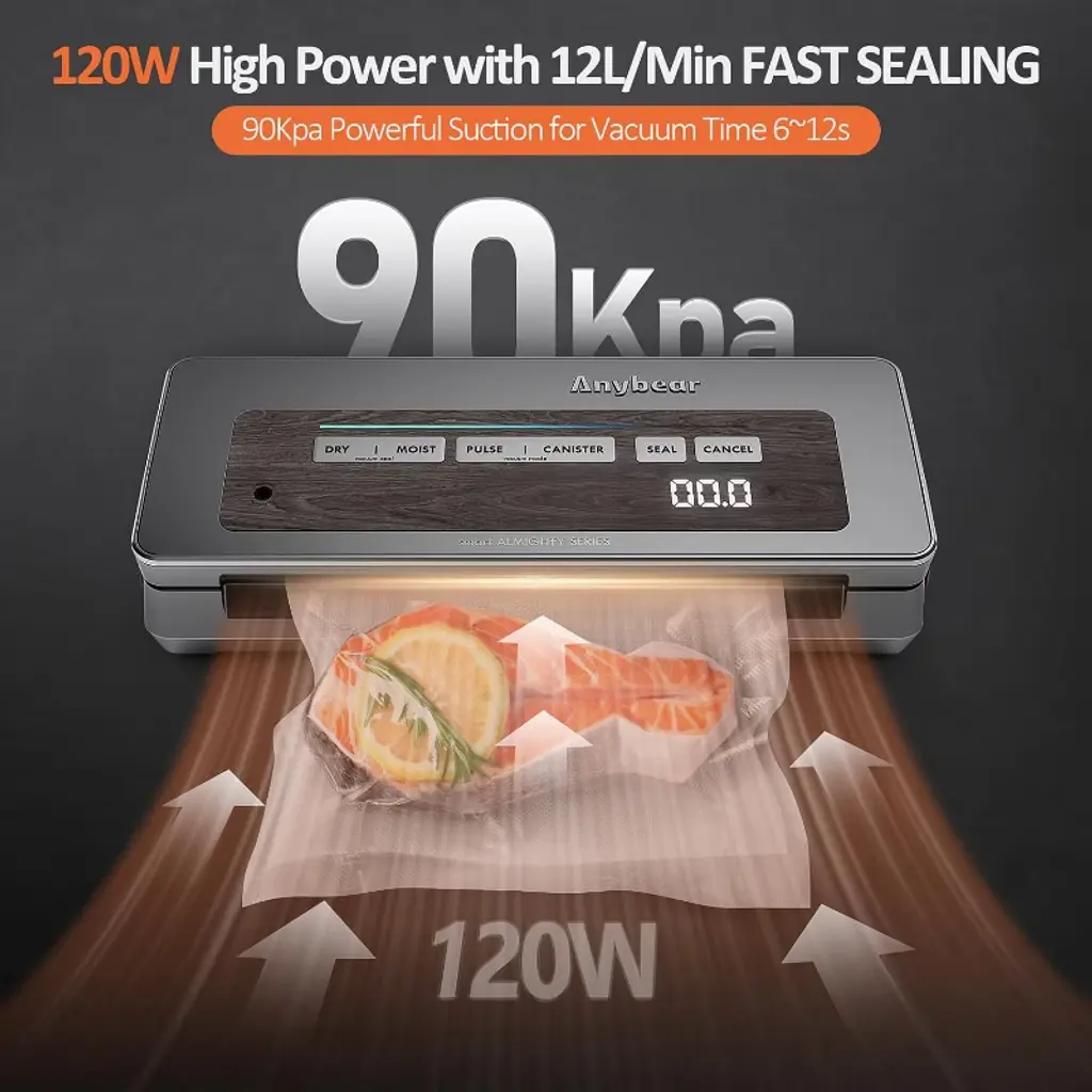 The food sealer equipped with 5mm Widened Heat Sealing Line and 12mm Sealing Strip, this feature guaranteed you every sealing is perfect. The heating line is wider than the normal vacuum sealer(2mm) and the 12mm sealing strip help the 5mm widened heating line to concentrate the heat much better. Every bag will get a widened seal, which will be more safe for you to protect food. The vacuum sealer Meeting your needs for bulk food sealing and packing.