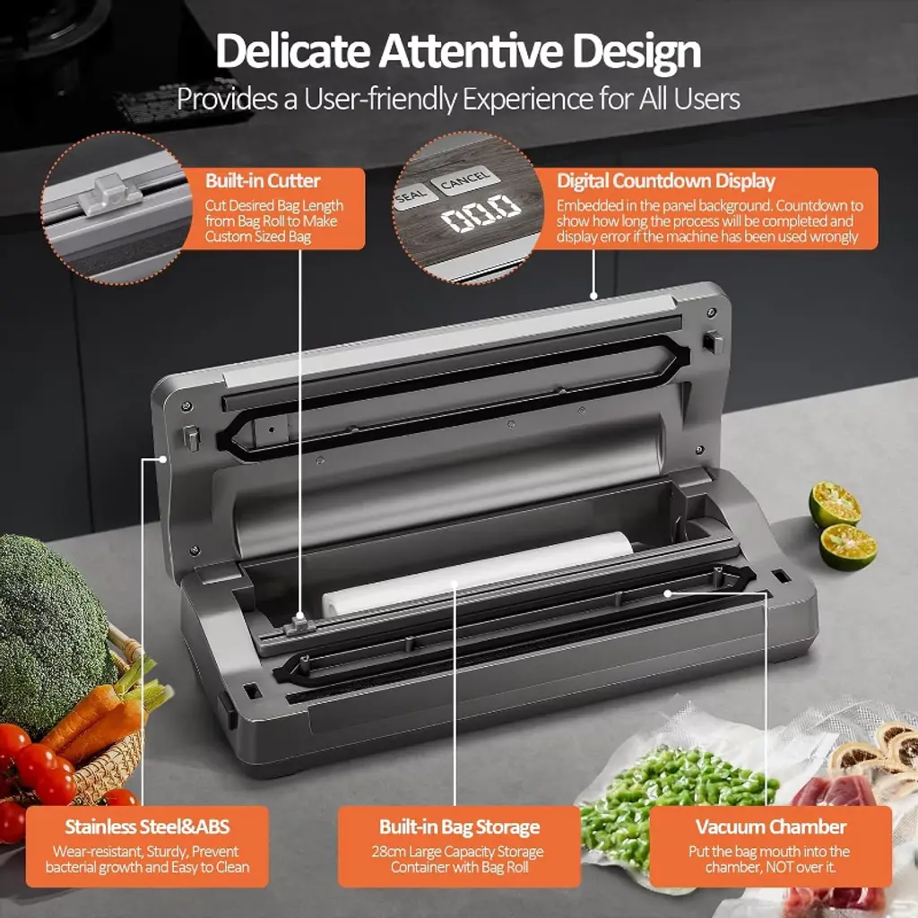 Cowlown Gray Vacuum Sealer Machine, 90kpa 120w Wide Seal Powerful Food Storage, Build-in Cutter, Bags Storage, Digital Countdown Display