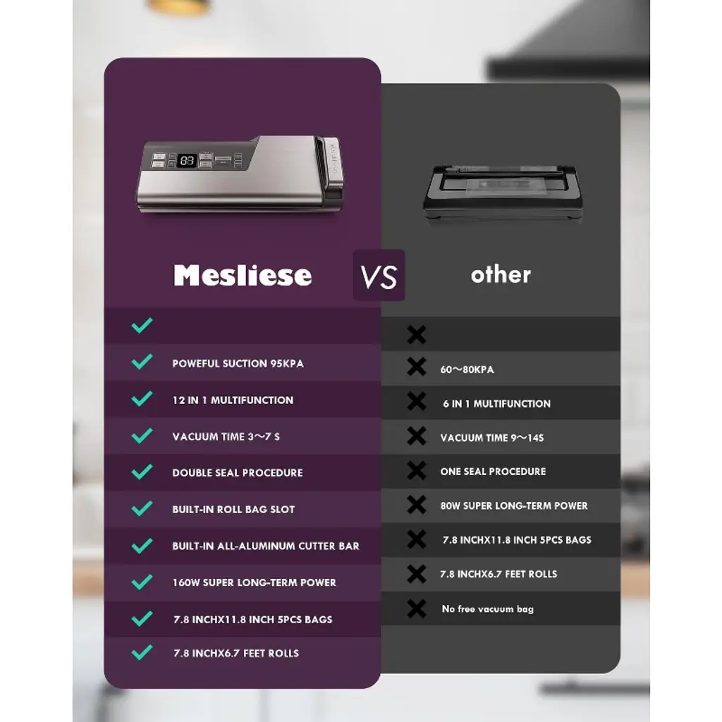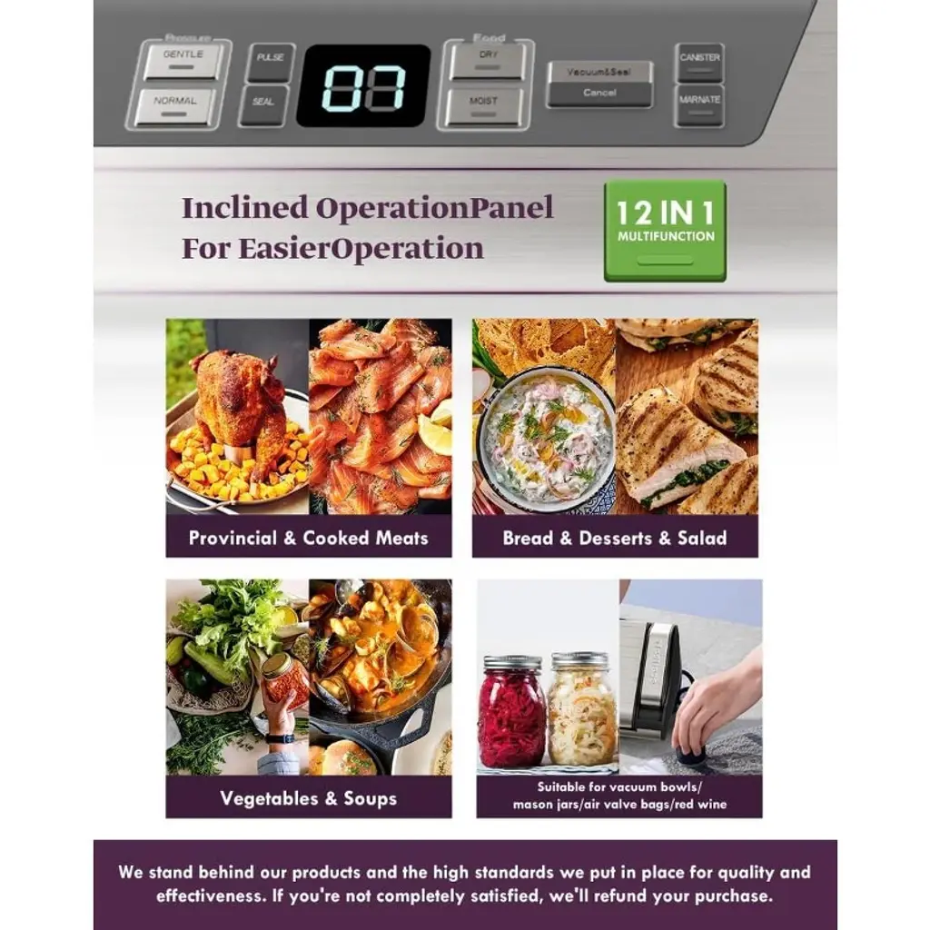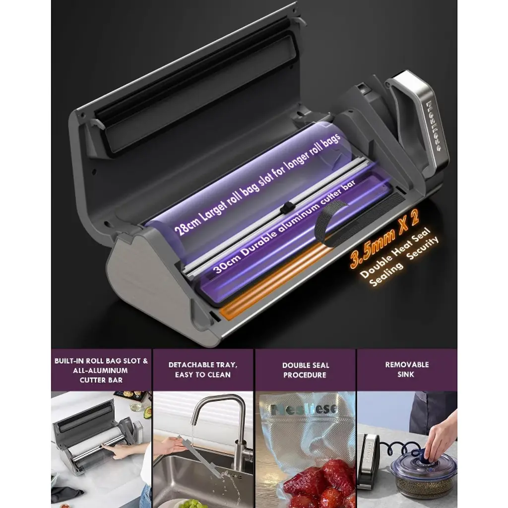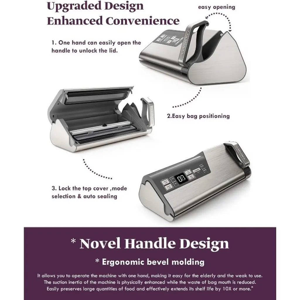 The vacuum sealer machine equipped with 95kPa 140W vacuum pump, only takes 3-8 seconds to complete the food vacuum sealing. The Patented Cooling System enables the sealer machine to work more than 200 times Continuously without overheating, and avoid the melt of the bags. The vacuum sealer Meeting your needs for bulk food sealing and packing.