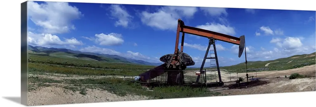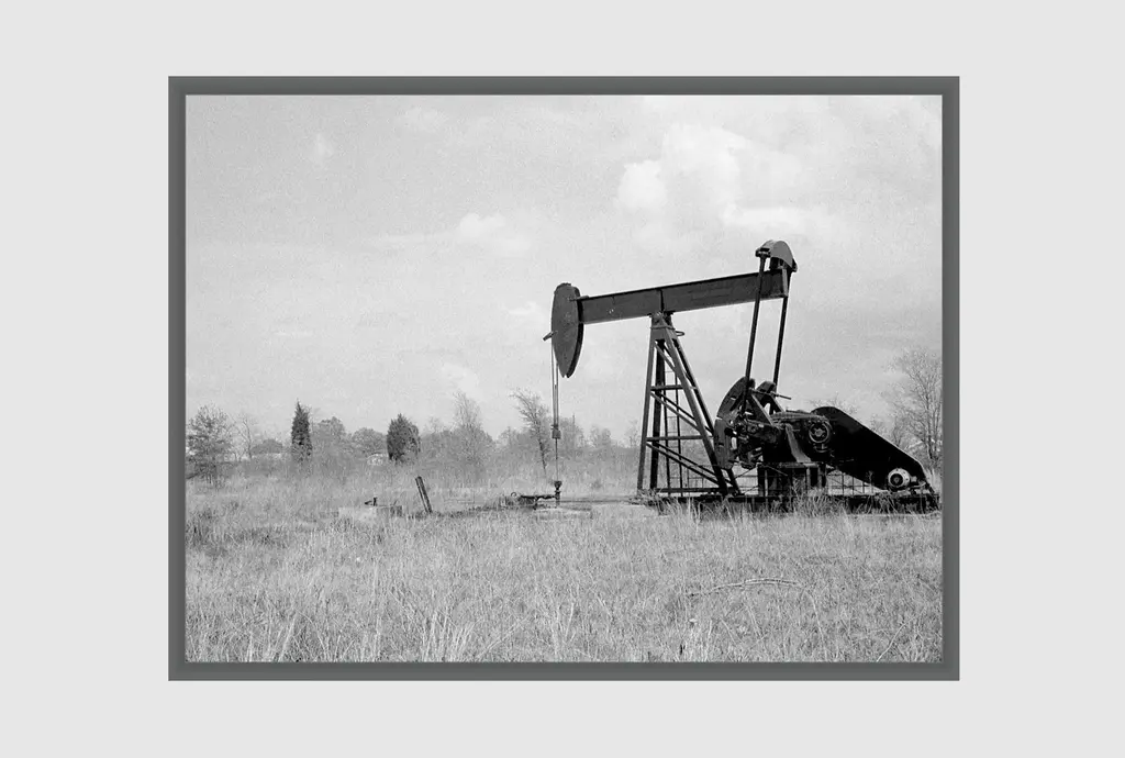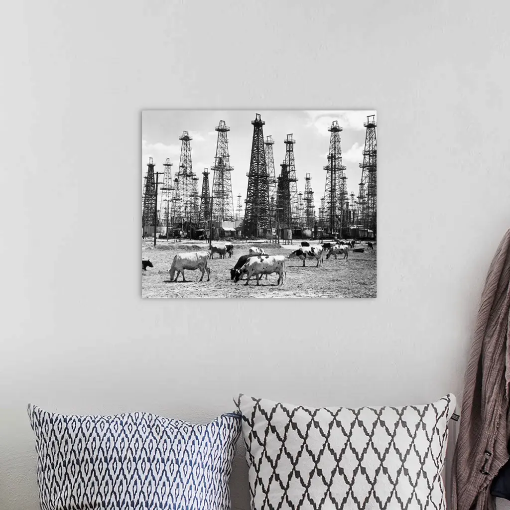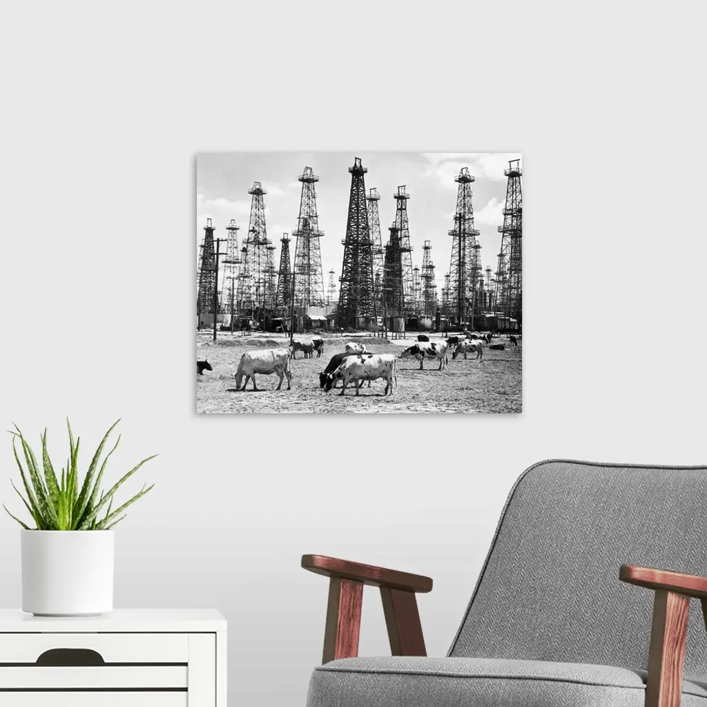 Cows grazing near oil wells in a southwestern American state. Undated photograph.