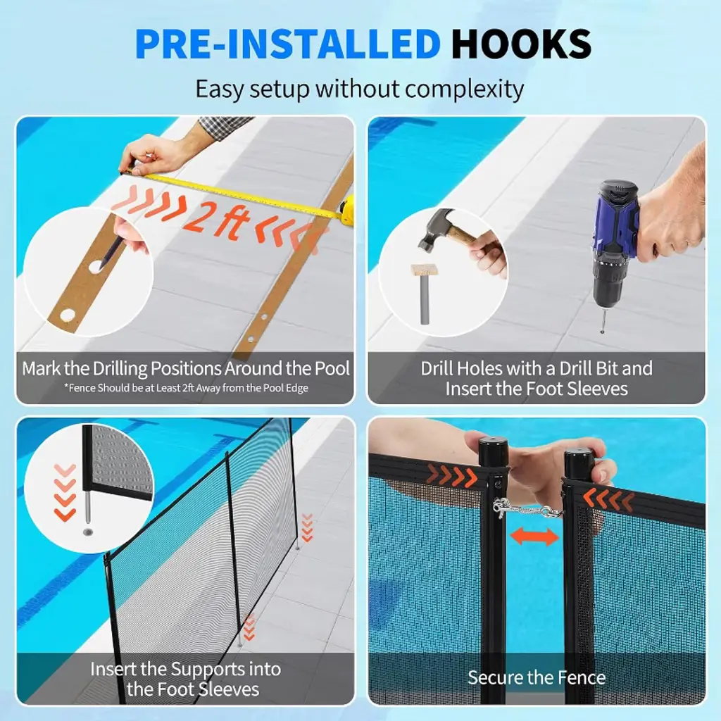 COZONY’s removable pool safety fence provides reliable protection for inground and above-ground pools. Made with 320GSM heavy-duty mesh and a stainless steel frame, this 4FT high barrier is adjustable from 48FT to 72FT to fit various pool shapes. Easy DIY installation and removal make it ideal for temporary or seasonal use. Keep children and pets safe around pools, gardens, and decks.