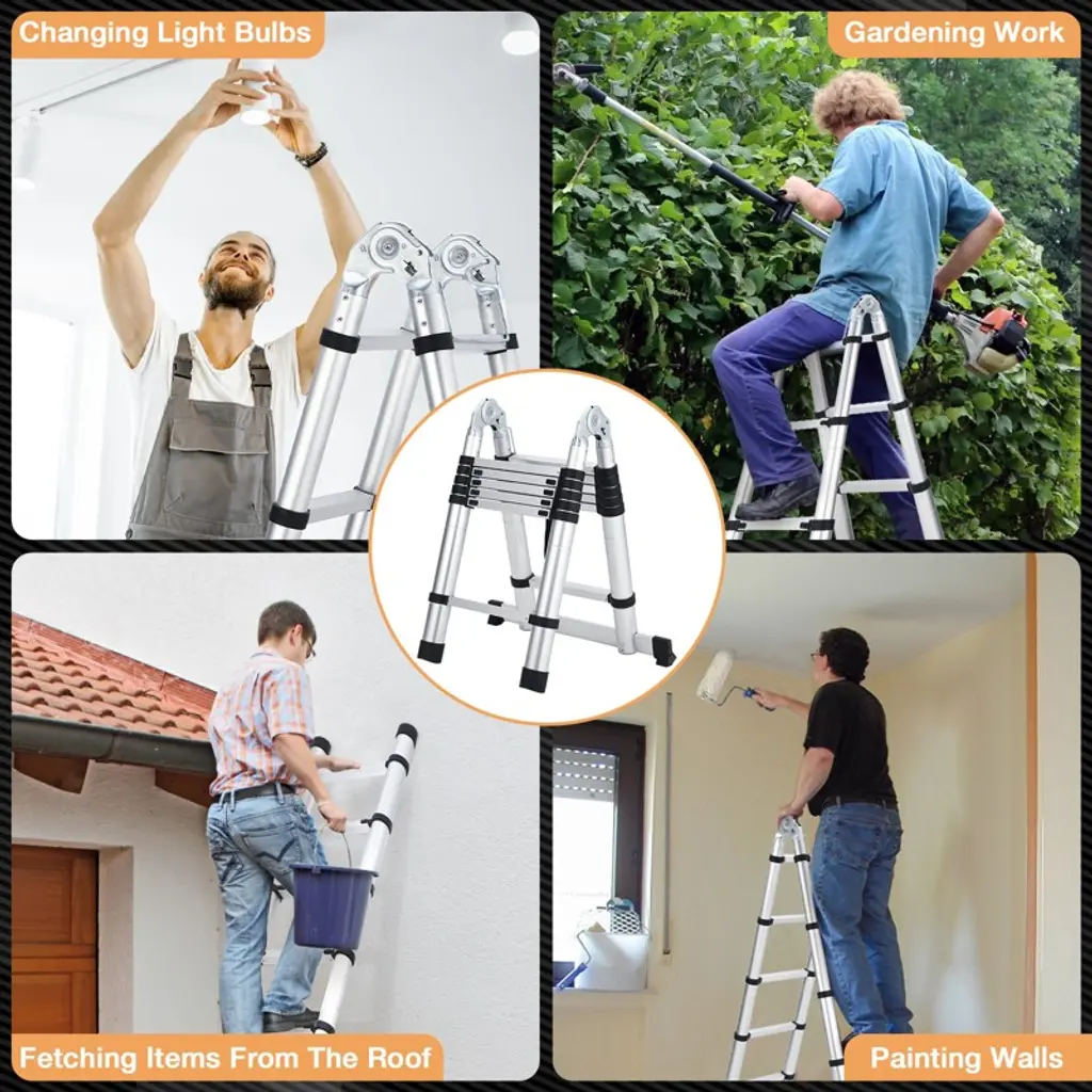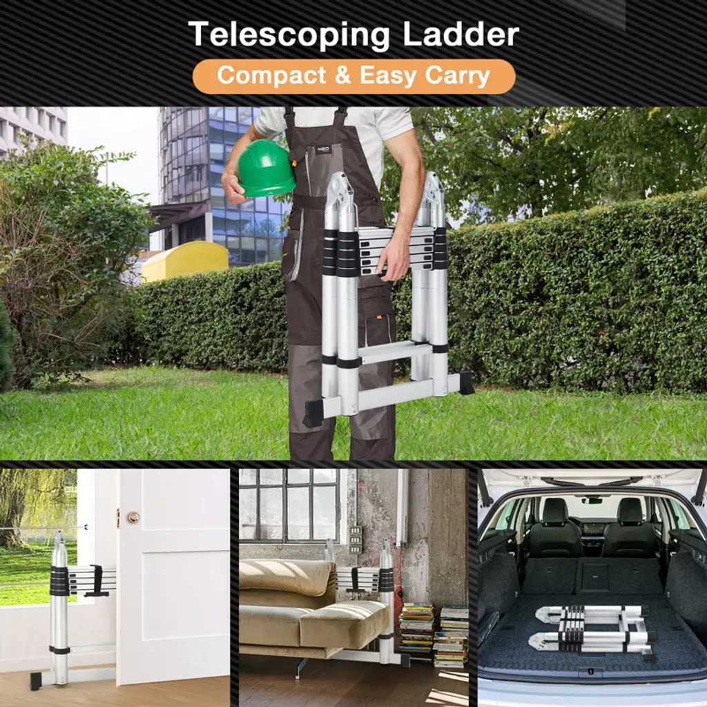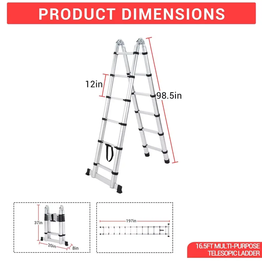 This heavy-duty telescoping ladder extends to a height of 12.5 feet and is constructed from durable aluminum for a sturdy yet lightweight profile. It features non-slip end caps and stabilizer bars for enhanced safety and stability during use. The compact, collapsible design allows for easy storage and transport. Ideal for a wide range of tasks including household maintenance, warehouse work, and outdoor projects.