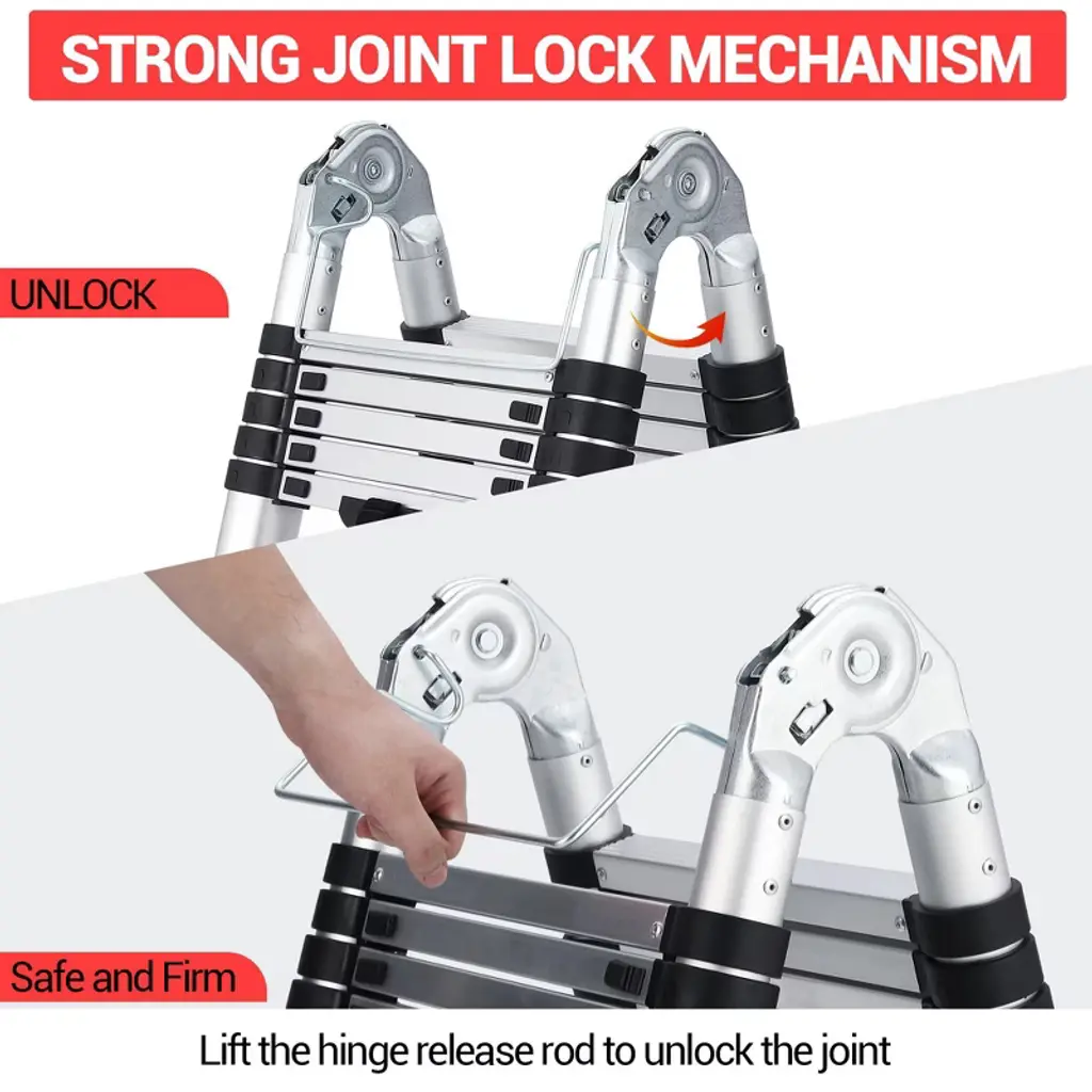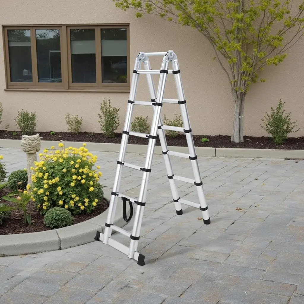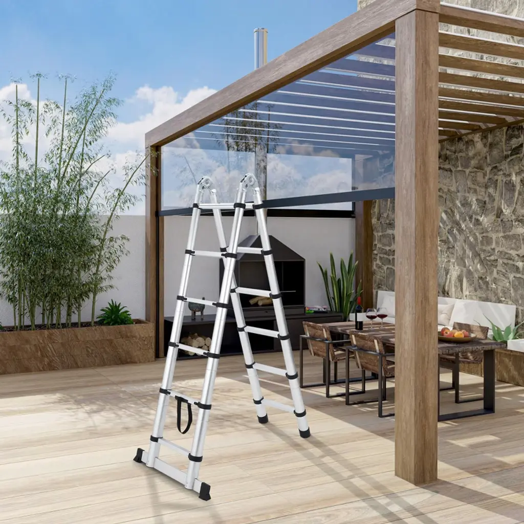 This heavy-duty telescoping ladder extends to a height of 12.5 feet and is constructed from durable aluminum for a sturdy yet lightweight profile. It features non-slip end caps and stabilizer bars for enhanced safety and stability during use. The compact, collapsible design allows for easy storage and transport. Ideal for a wide range of tasks including household maintenance, warehouse work, and outdoor projects.