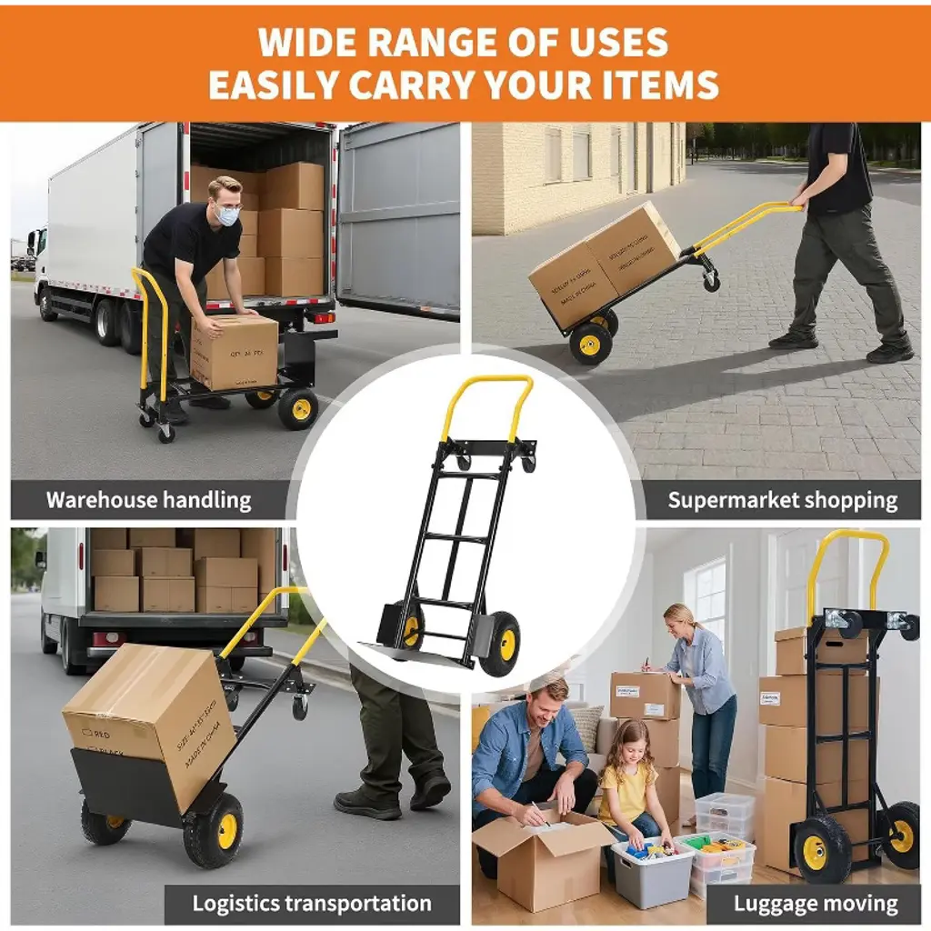 The COZONY Foldable 2-in-1 Hand Truck & Platform Cart combines convenience and versatility in one easy-to-use dolly. Designed to handle up to 400 lbs, it quickly transforms from a two-wheel hand truck for stairs to a four-wheel platform cart for heavy, bulky items. The upgraded 8" non-marking rubber wheels provide a smooth, quiet ride and protect floors from scratches, while the adjustable ergonomic handle ensures comfort and reduces strain during transport. With its foldable, space-saving design, it’s perfect for moving houses, warehouse logistics, or even airport luggage. No assembly required—just unfold and get to work.