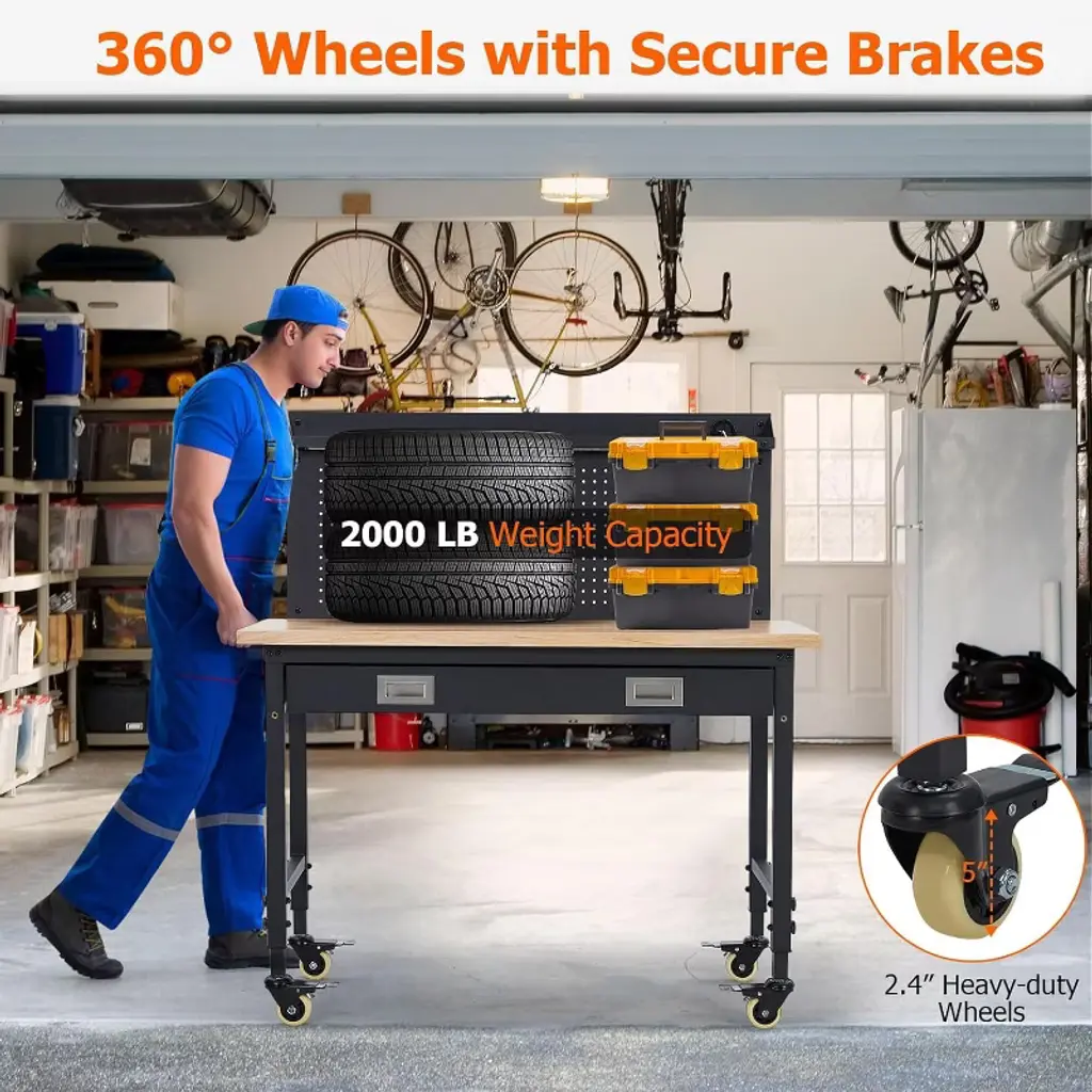 This versatile workbench features a sturdy rubber wood top and an integrated pegboard for flexible tool organization. The height is adjustable from 80cm to 100cm to suit various tasks and user preferences. Enhanced with a useful drawer and locking casters for mobility and stability, this workstation provides a practical storage solution for garages, workshops, and warehouse environments.