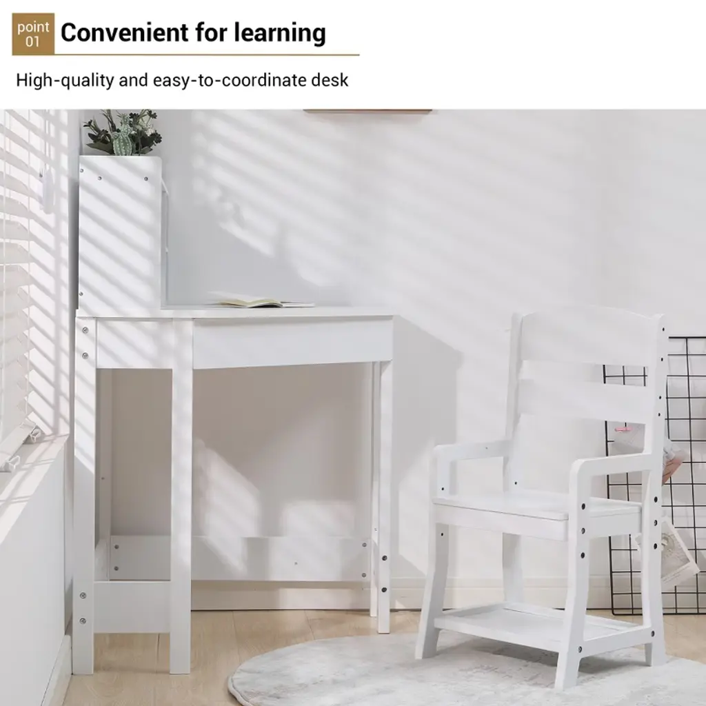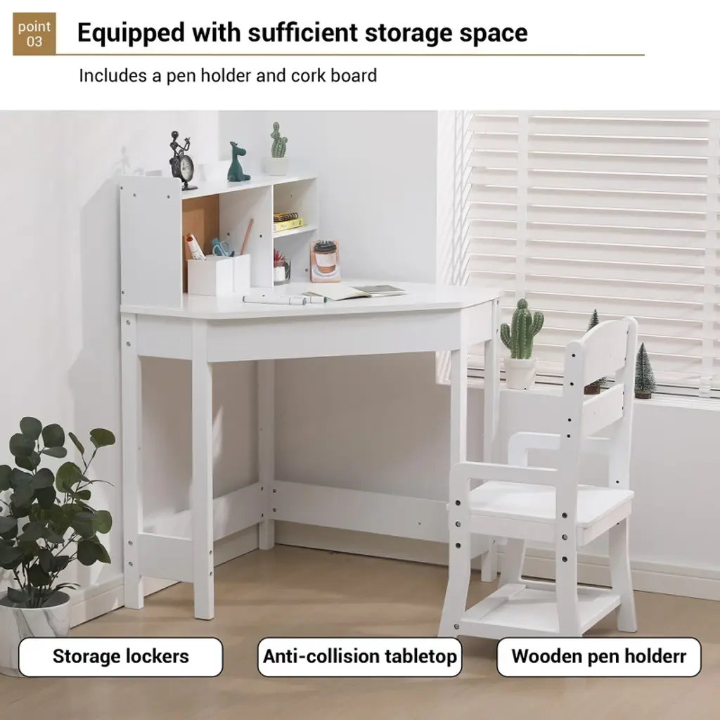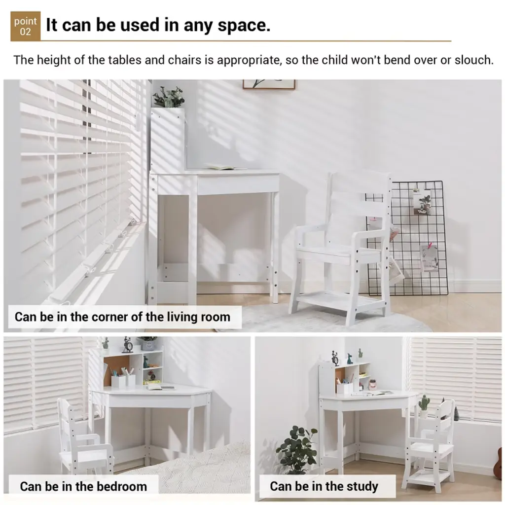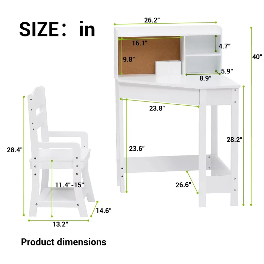 Save space with this Kids Corner Desk and Chair Set. The triangular desk fits snugly into corners, with a hutch, bulletin board, shelves, and drawers to organize books and art supplies. Sturdy MDF with rounded edges; adjustable child-size chair for ages 3–8. Easy assembly.