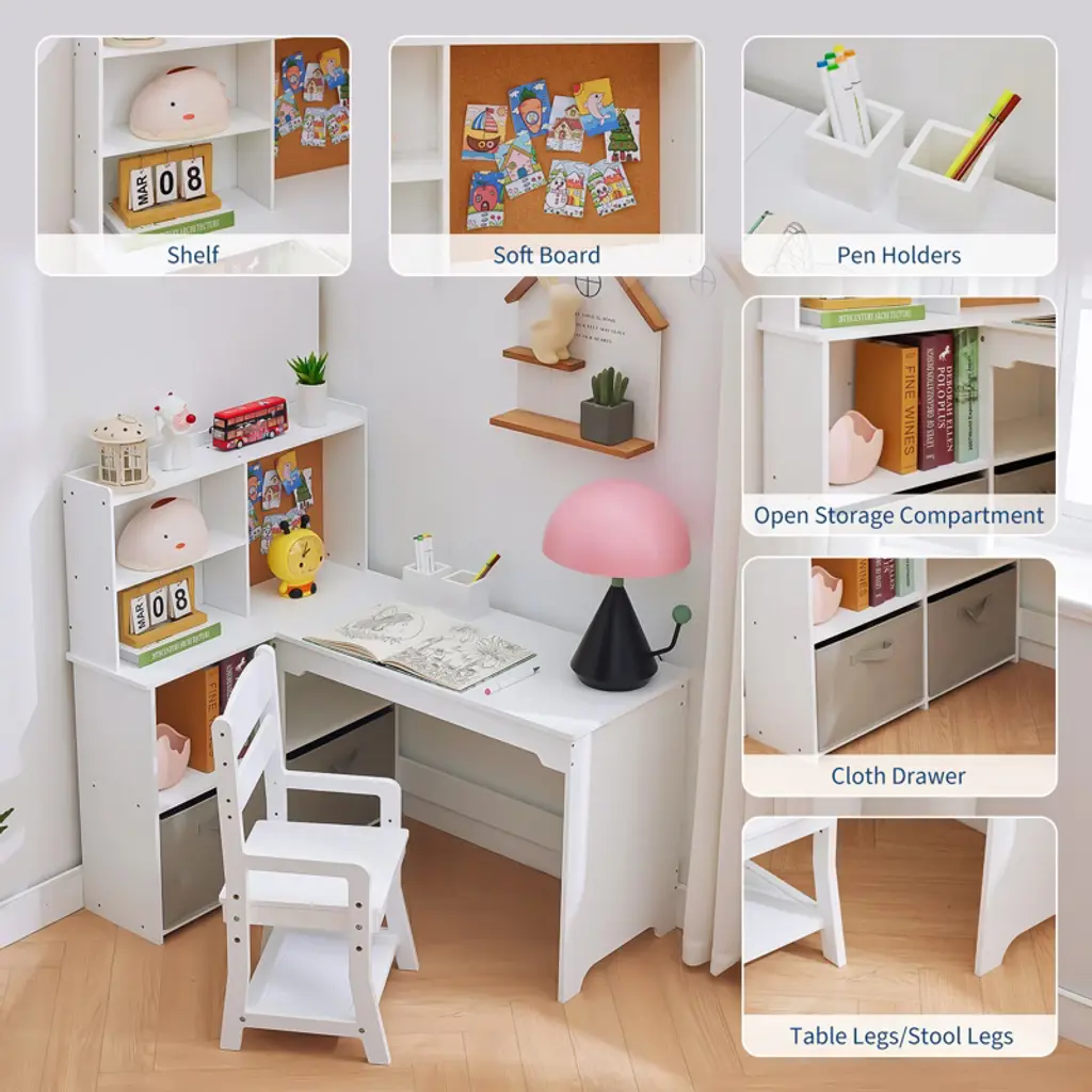 Kids corner desk and chair set saves space with an L-shaped layout. Bulletin board, shelves, cabinets, and fabric drawers keep books and art supplies tidy. Sturdy MDF with rounded edges; child-size chair for ages 3–10. Easy assembly for bedrooms or playrooms.