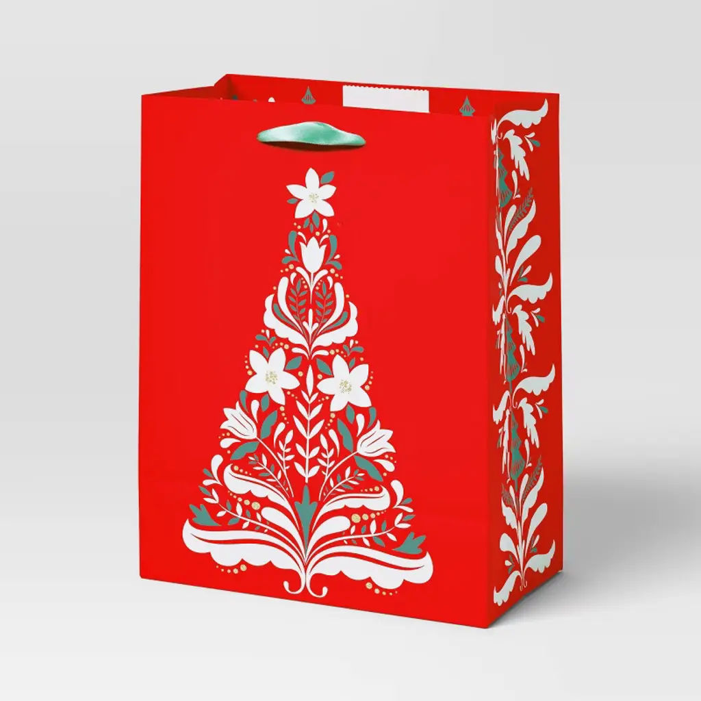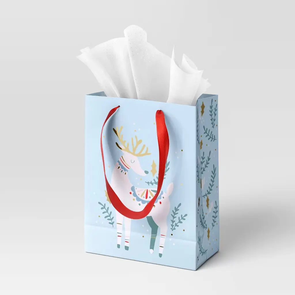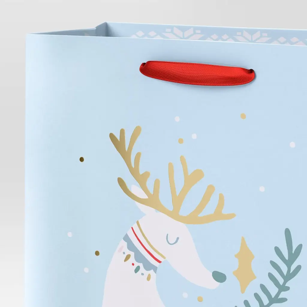 Spread the holiday cheer by handing out your gifts in this Cozy Christmas Cub Deer Bag from Wondershop™. This Christmas gift bag features a cute deer with multicolor detailing on the front and Christmas-themed icons on the sides and a light blue backdrop for a cheerful, festive look. Made of paper, this holiday bag also comes with a red fabric handle for easy carrying. Welcome to the Wondershop™.