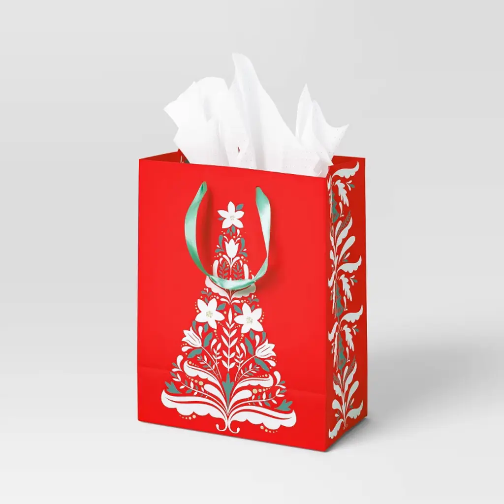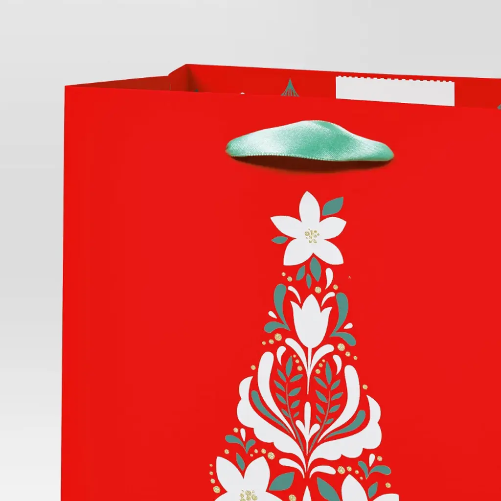 Bring a touch of Scandinavian charm to your holiday presents with this Cozy Christmas Cub Scandinavian Tree gift bag from Wondershop™. This Christmas gift bag features a large Scandinavian Christmas tree graphic with vibrant print on a red backdrop, and it boasts festive print on the sides for even more seasonal charm. Made of paper, this gift bag also has a green fabric handle for easy carrying. Welcome to the Wondershop™.