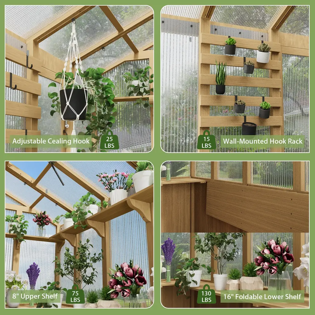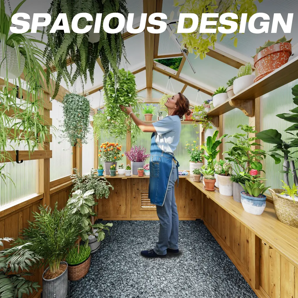 DESCRIPTION:Cozywor 6.8 x 7.8 ft Spruce Wood and Polycarbonate Walk-in Greenhouse, your ideal solution for nurturing plants and vegetables while enjoying the sun. Crafted with a sturdy spruce wood frame, this greenhouse is designed with precision—precut and predrilled for effortless assembly and exceptional durability. The double-wall polycarbonate windows provide abundant sunlight for healthy growth during winter while shielding your plants from harsh UV rays in summer, creating a balanced environment for year-round gardening. With 16” deep lower shelves and 8” deep upper shelves lining both sides, you’ll have ample space for potted plants, seed trays, and tools. The shelves are foldable, providing extra space when needed. Equipped with an automatic roof vent window that responds to heat, this greenhouse ensures optimal temperature control, helping to maintain a healthy climate for your plants. Whether you’re gardening, working, reading, or relaxing, the Cozywor greenhouse adapts to your needs, making it a versatile addition to any outdoor space.FEATURES:Sturdy Frame Construction: Made of European Spruce Wood and premium hardware, offering exceptional durability and resistance to decay, ensuring long-lasting performance. It can be used not only on sunny days but also on rainy and snowy days. The greenhouse also has a sturdy base support and reinforced structure.Upgraded Polycarbonate Panel: Composed of bright and semi-bright polycarbonate panels, providing 99.99%6 UV protection. The polycarbonate panel provides enough sunlight for plants while blocking harmful UV rays. Favor the better growth of plants.Adjustable Ventilation: Our greenhouses have optional multi-opening windows to ensure temperature balance and air circulation. Provide plants with a healthy ventilation system and the right temperature for growth.Temperature-oriented Auto-ventilation: Roof vents can sense temperature changes and automatically adjust to open and close, promoting optimal temperature control for a healthy climate for your plants.Generous Shelf Space & Foldable Shelves: Equipped with 16 inch deep lower shelves and 8 inch deep upper shelves, ideal for organizing plants and tools, enhancing efficiency in gardening tasks. The shelves are foldable, providing flexibility to create additional space when needed, adapting to various gardening needs.Multi-Scenario Use: Versatile design allows the greenhouse to be used for gardening, reading, or relaxing, making it a valuable addition to any outdoor space. You can add a coffee table and other furniture in the greenhouse to decorate the greenhouse into a warm space.Secure and Lockable Door: The greenhouse features a secure, lockable door with a ventilated window, ensuring safety while allowing for air circulation.Design and Creativity: There are screw holes on the outside of the greenhouse so that customers can add lights and hooks according to their preferences and needs.LOAD CAPACITY:Side panel hooks: 15lbsUpper Shelve: 75lbsLower Shelve: 130lbsTop Hooks: 25lbsSPECIFICATION:Dimensions: 75”W x 92.87”H x 91.50”D inchAssembled Product Weight: 448.86lbsSnow Load Rating: 1500lbsWind Resistance: 54MPHTIPS: The greenhouse will be delivered in 5 boxes.