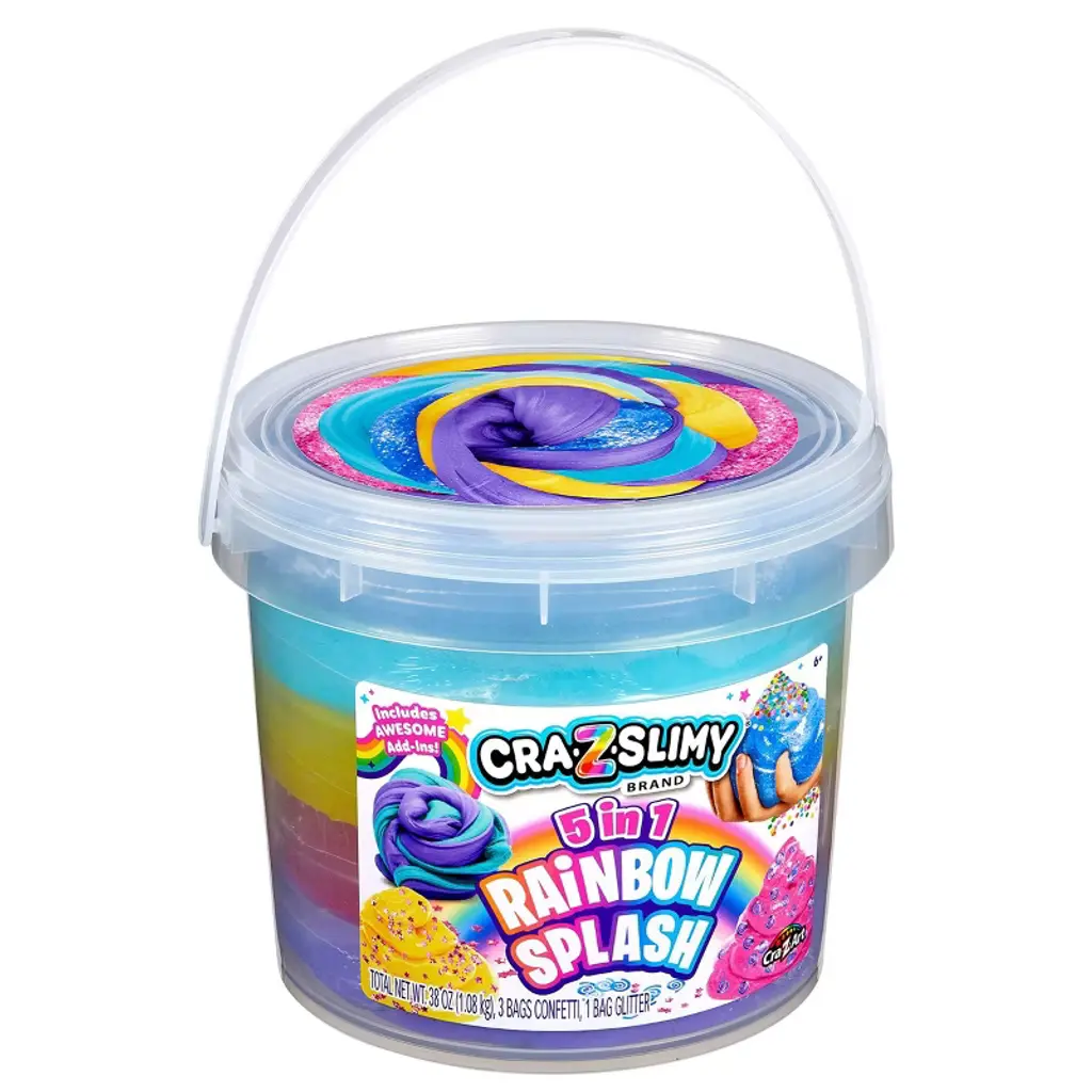 Dive into a world of color, sparkle, and squishy fun with the Cra-Z-Slimy 5-in-1 Rainbow Splash! This all-in-one slime bucket includes five vibrant slimes—featuring 2 glitter slimes, 2 smooth butter slimes, and 1 glossy scented slime. Customize your slime creations with 3 different confetti shapes and a bonus bag of glitter for extra shimmer. When you're done playing, store everything neatly in the reusable bucket—perfect for slime lovers on the go!