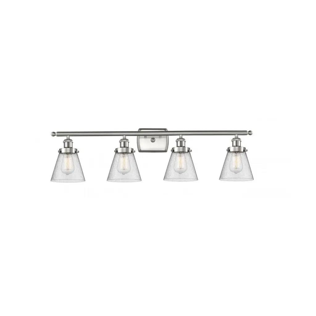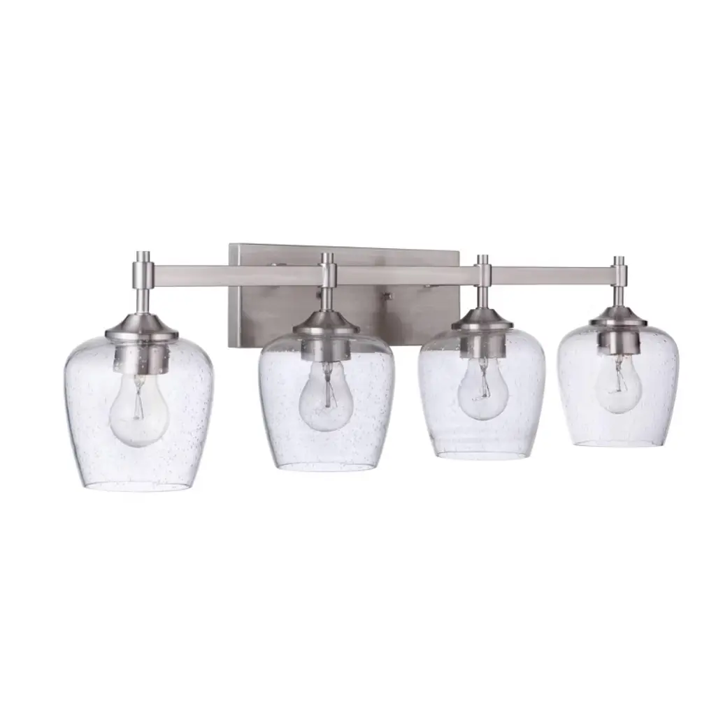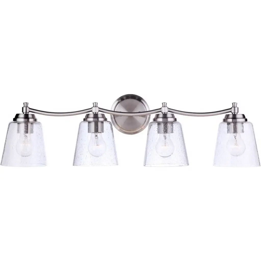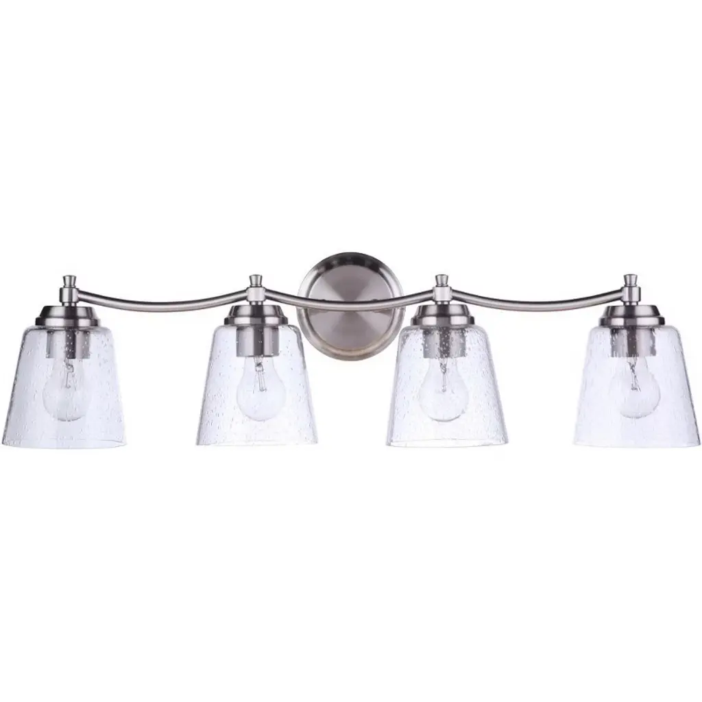 The simple and effortless design of the Tyler collection showcases clear seeded or white frosted glass and casts a warm and beautiful glow in your home. Clear seeded glass - 5.5 inchd Requires 4 medium base, 60 watt bulbs (not included) Backplate is 5.3 inch diameter Extends 7 inch from wall. Warranty: 1 Year Limited Shade Included: Yes