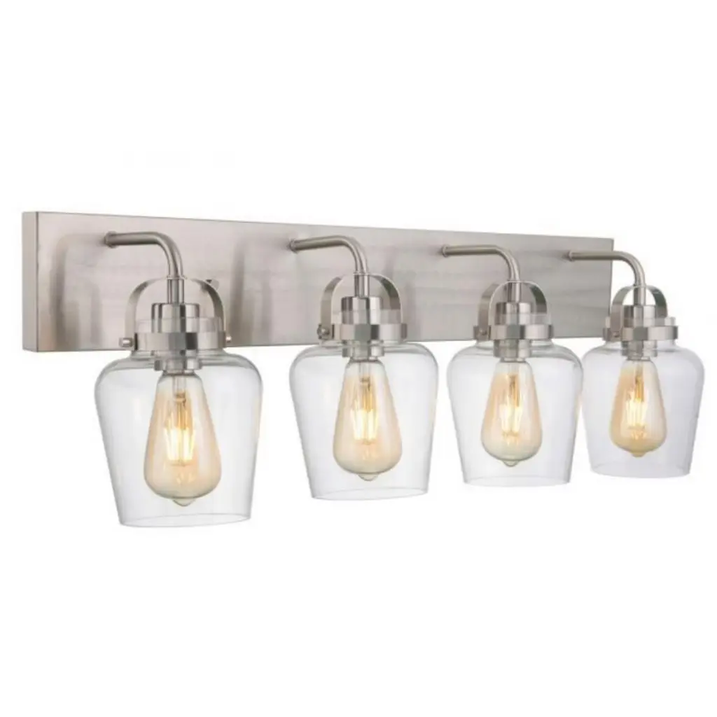 The functional minimalism of the Trystan collection with it's eye-catching silhouettes and clear glass captured globes offers innovative lighting without overwhelming your decor. Clear Glass Shades (included) Requires 4 Medium base, 60 watt bulbs (n 1 Year 11.5 Mounting Direction: Up/Down Shade Included: Yes Material: Steel, Finish Color: Brushed Polished Nickel, Width: 30", Height: 10", Length: 30", Depth: 7.5", Height From Outlet Box: 2.4", Backplate Width: 30.04", Backplate Length: 4.75", Number Of Bulbs: 4, Wattage: 60 Watts, Dimmable: No, Moisture Rating: Damp Rated