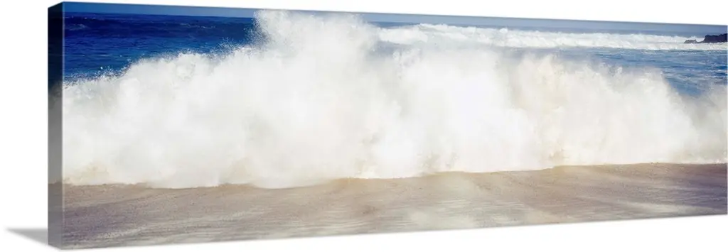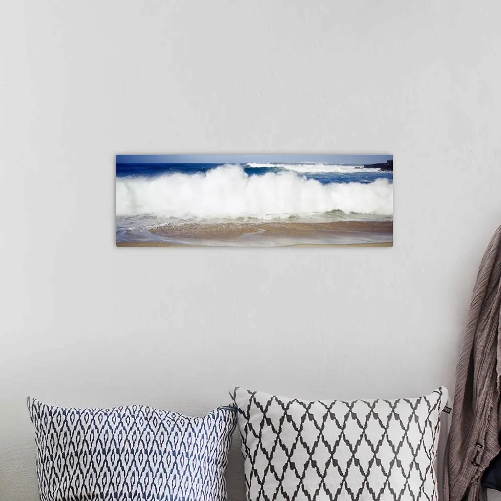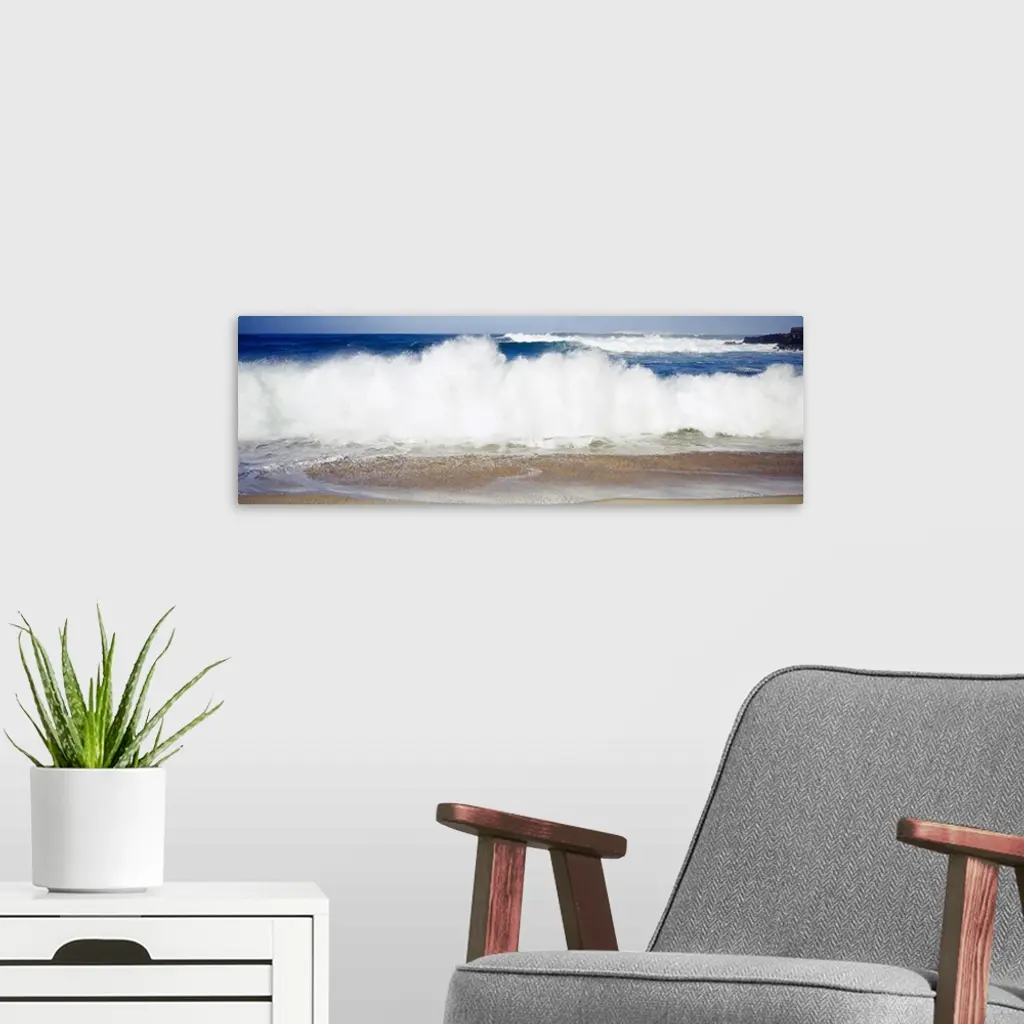 Panoramic photograph of large waves crashing into the beach, bright blue water in the background, in Waimea Bay, Hawaii.