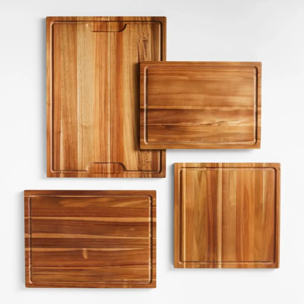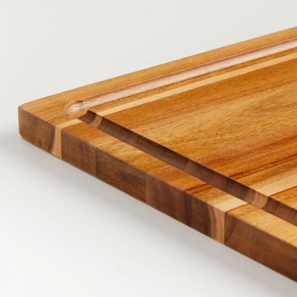 The intentionally simple designs of our signature Crate & Barrel cutting boards keep all the attention on the beauty of wood. Lengths of acacia in contrasting tones stripe this edge-grain board in a dynamic, organic pattern. Use the grooved side to collect juices and crumbs as you cut, or flip the board over to serve cheese, charcuterie or appetizers. Modern yet timeless, our acacia edge-grain cutting board offers versatility, classic good looks and a natural durability that stands up easily to everyday use.Direct from our design team to your kitchen, the sophisticated assortment in our signature The Kitchen by Crate line combines beautiful simplicity and peerless performance. From initial sketches to rigorous testing, every expertly designed product in this kitchen collection meets our standards, and yours.By choosing FSC ®-certified cutting boards, you are supporting responsible management of the world's forests.View all "The Kitchen by Crate" collection