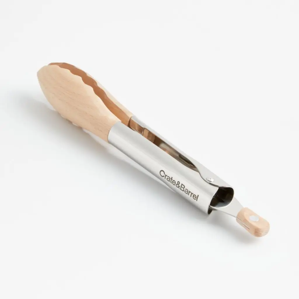 Turn grilled pork chops, toss salad and flip fried tofu with our signature beechwood and stainless steel tongs. The sleek stainless steel handle provides a comfortable grip, while sustainable beech shapes scalloped heads that grab foods securely. Fitted with a beechwood finial, the locking mechanism allows for compact storage. Combine the small tongs with the other exquisitely proportioned utensils in our exclusive Crate & Barrel collection for a well-outfitted workspace that's up to any cooking challenge.Direct from our design team to your kitchen, the sophisticated assortment in our signature The Kitchen by Crate line combines beautiful simplicity and peerless performance. From initial sketches to rigorous testing, every expertly designed product in this kitchen collection meets our standards, and yours.By choosing FSC ®-certified utensils, you are supporting responsible management of the world's forests.View all "The Kitchen by Crate" collection