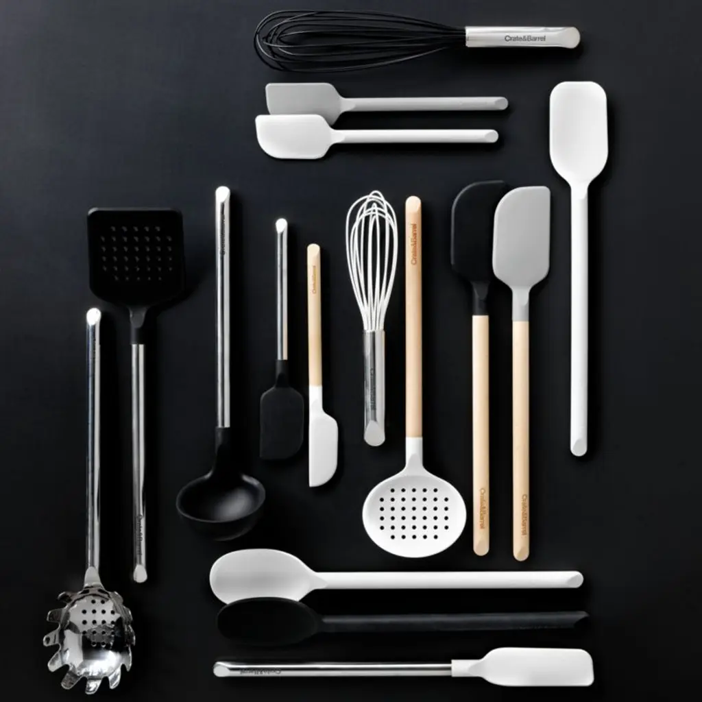 Stir, scoop and serve with our signature black silicone and wood spoon. Constructed with a nylon core for strength, the silicone head ably stirs the thickest sauces, doughs and battersor folds the most delicate meringues. Its flexible, tapered edges scrape the bowl, blender or pan perfectly clean, and soft-touch silicone won't damage non-stick cookware and resists stains, scratches and heat up to 600 degrees. Natural beechwood shapes a cylindrical handle for a sturdy grip and a warm, classic look. We love the way the refined beveled edge finishes the elongated handle with a dynamic detail. Combine the black spoon with the other exquisitely proportioned utensils in our exclusive Crate & Barrel collection for a well-outfitted workspace that's up to any cooking challenge.By choosing FSC ®-certified utensils, you are supporting responsible management of the world's forests.View all "The Kitchen by Crate" collection